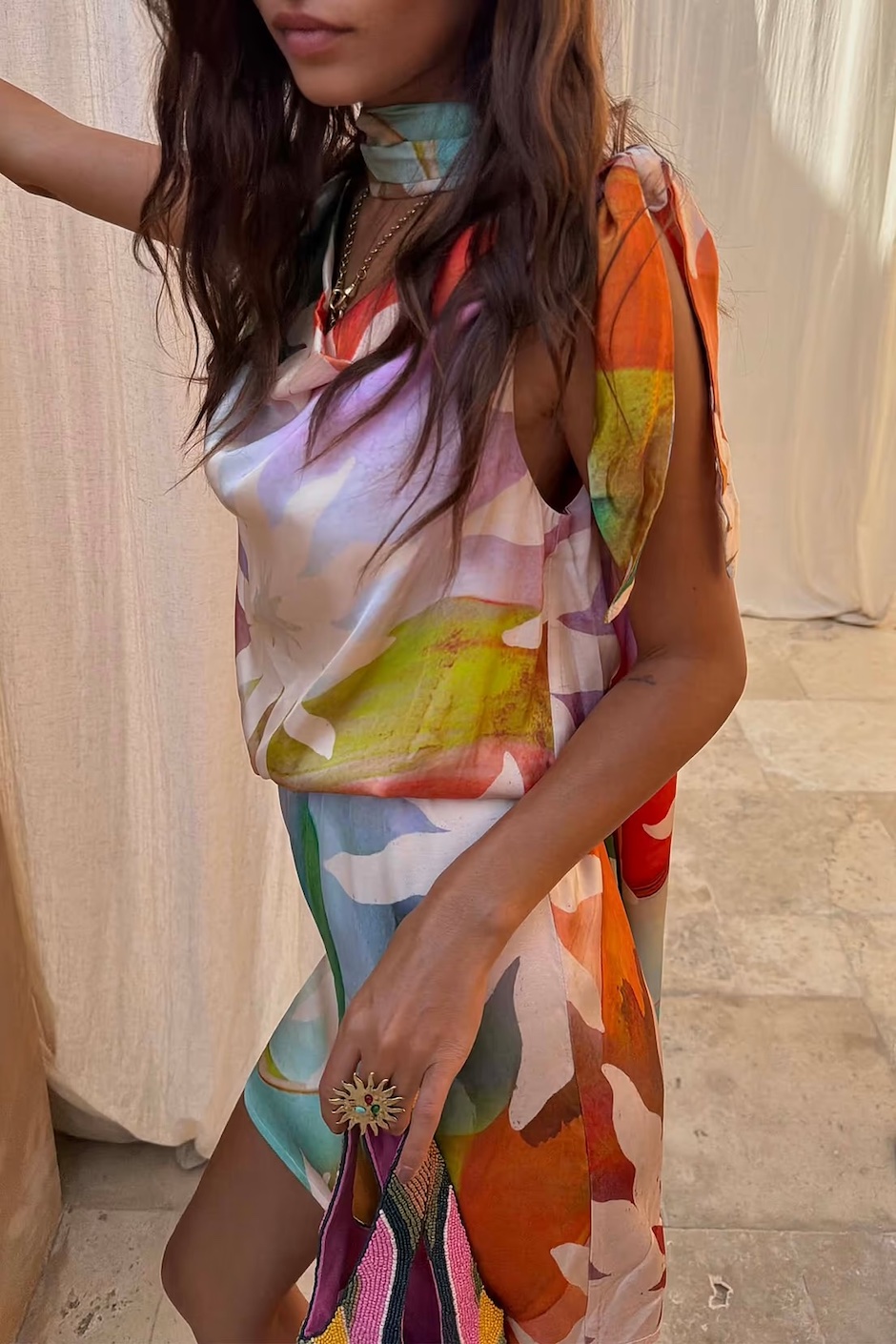 Vestido corto satinado con escote cascada y tirantes de lazada. Corte en la cintura con elástico. Pañuelo multiposición del mismo tejido incluido. Estampado de soles de la marca.
