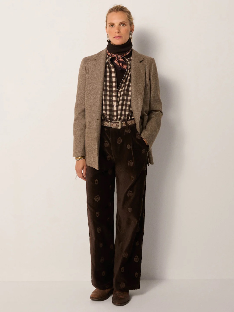 Blazer de lana en espiga que crea profundidad y textura. De estilo atemporal, con cuello solapa y manga larga. Cierre cruzado en frontal con botones. Tono nogal terroso que aporta solidez a su estructura.