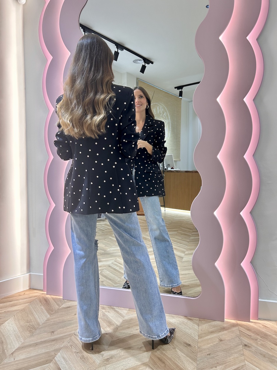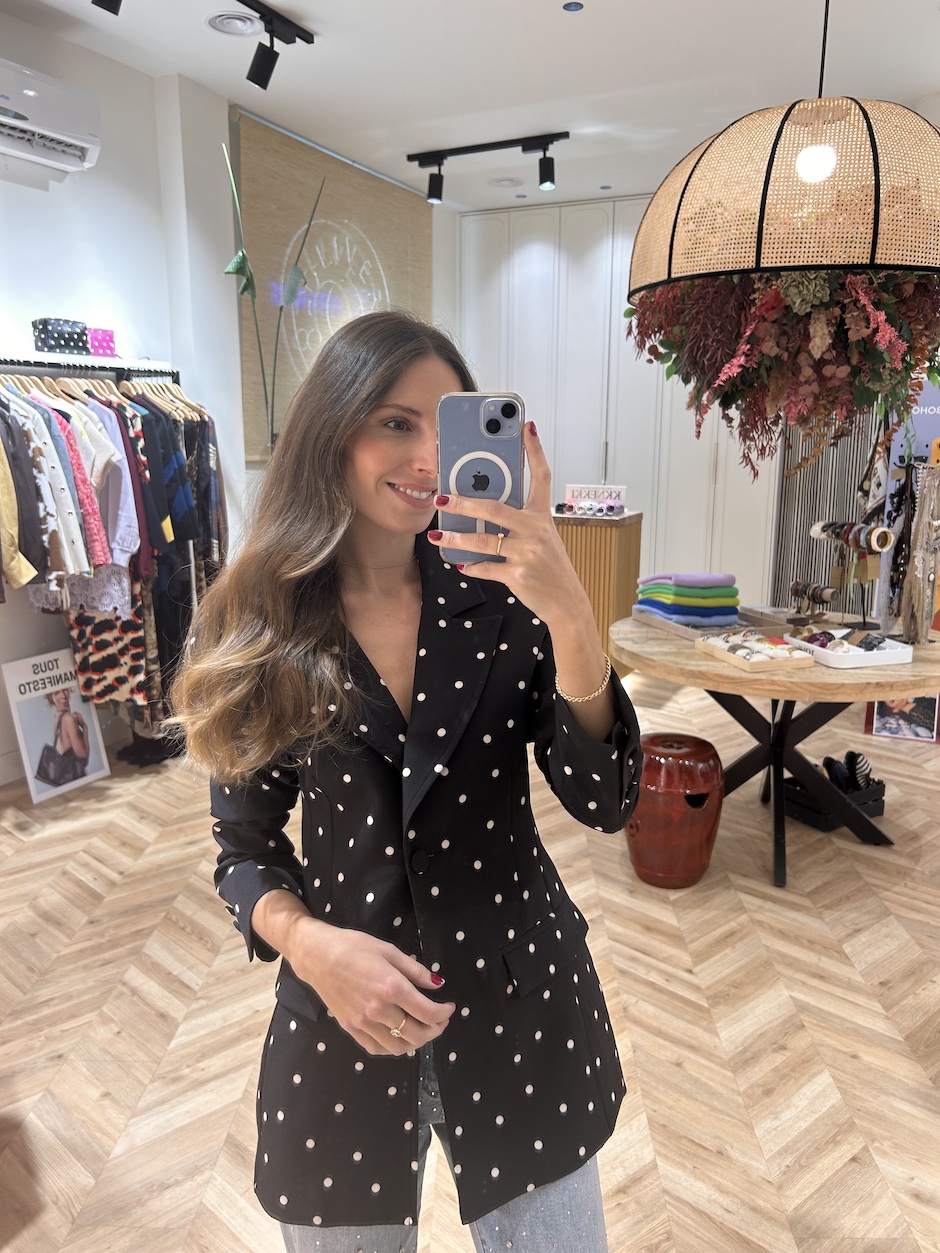 Blazer entallada con cuello solapa y manga larga con falsos botones del mismo tejido en puños. Cierre en frontal con botón del mismo tejido. Bolsillos de vivo en el pecho y bolsillos de solapa en laterales. Abertura en la espalda. Lleva forro.