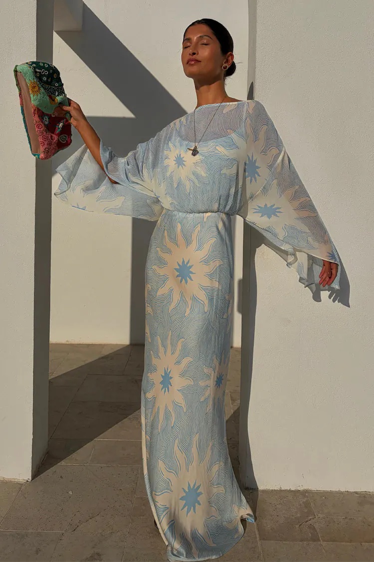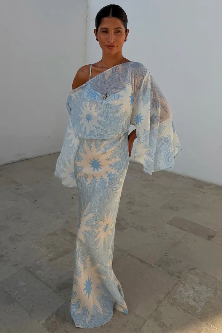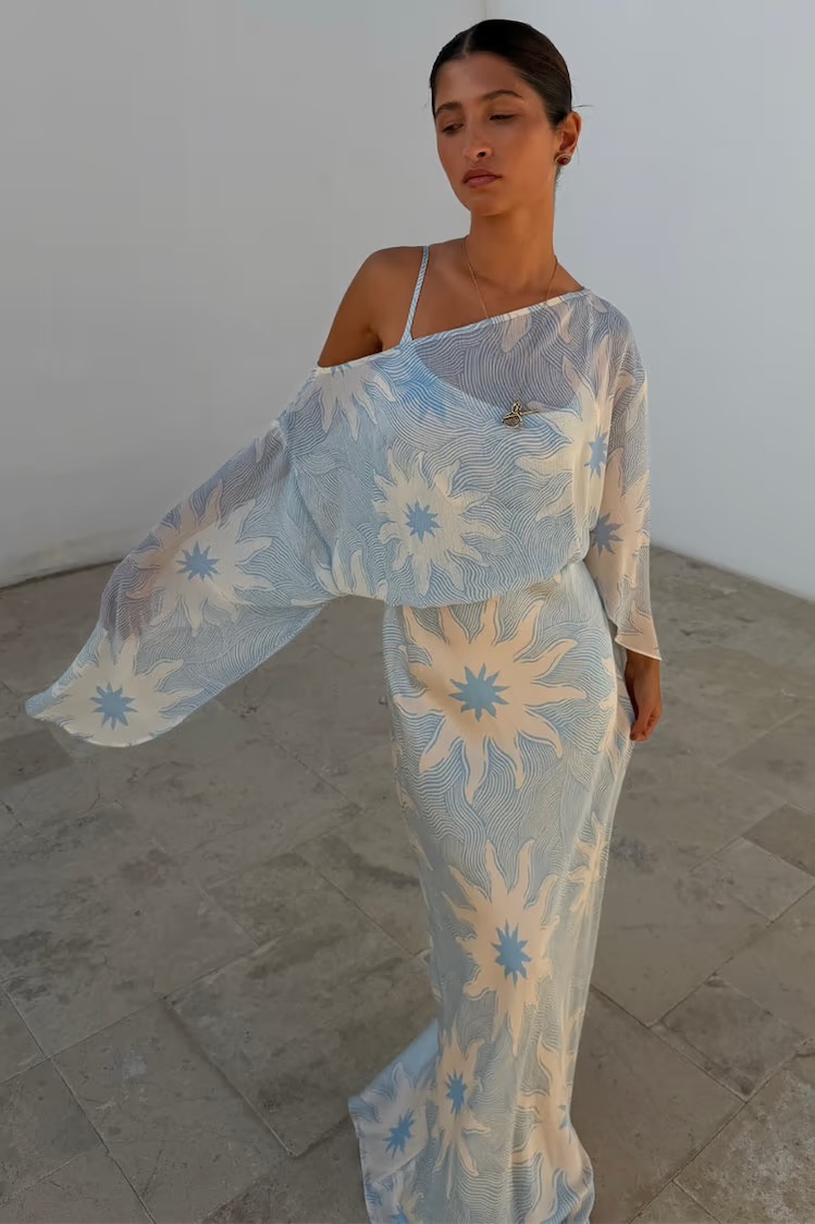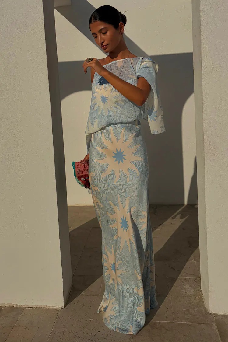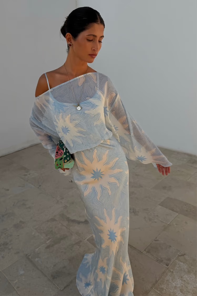 Nuestro estampado soleil combina nuestros icónicos motivos solares con el arte mediterráneo para crear un estampado de líneas finas que es perfecto para la temporada de bodas. Vestido con cuerpo semi transparente El top transparente, con cuello multi posición, para crear más movimiento. Corte en la cintura con cintura elástica. falda fluida satinada.