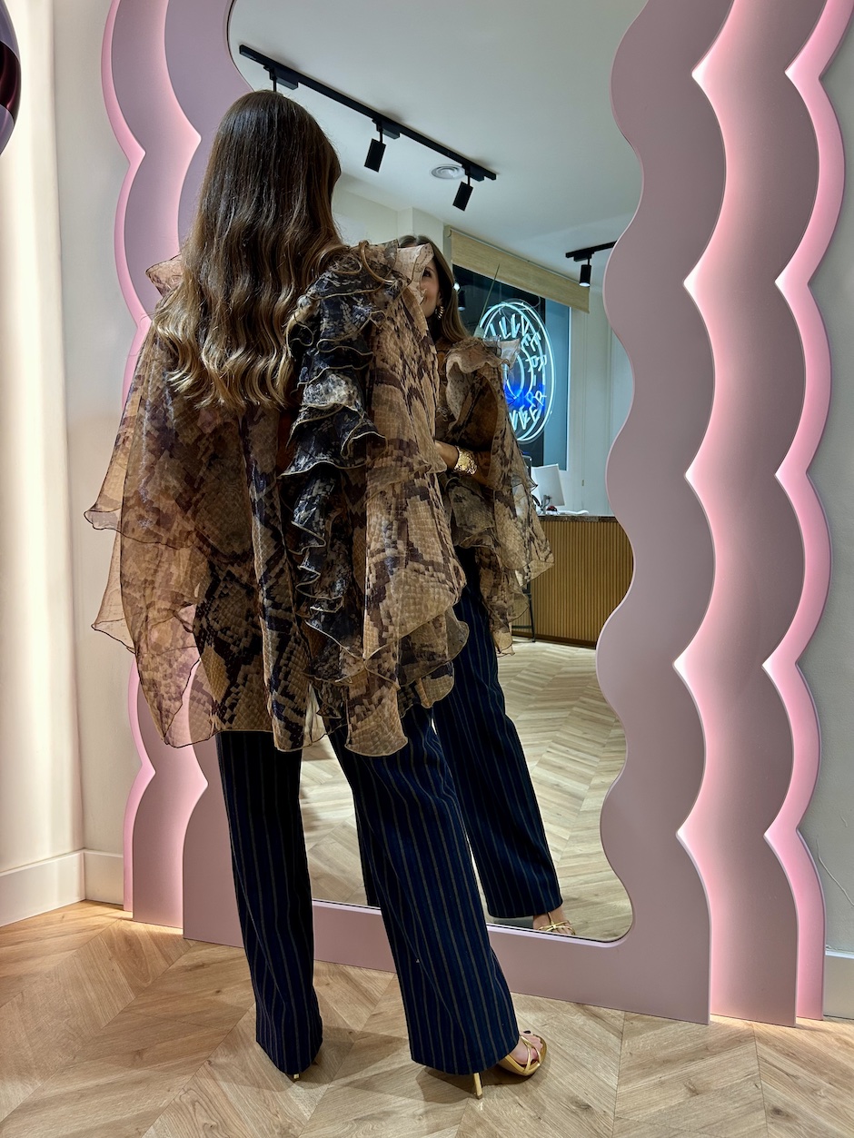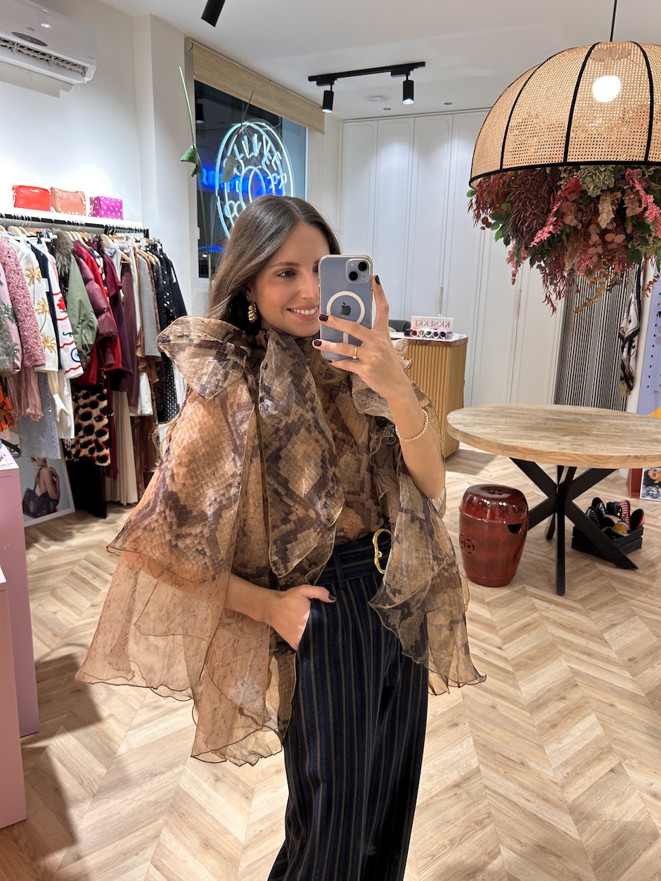 Blusa de organza con capas. Cuello perkins con lazada multiposición y mangas asimétricas con capas. Detalle de volante en lateral. Cierre en espalda con cremallera. Largo asimétrico.