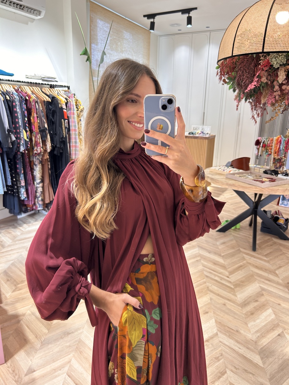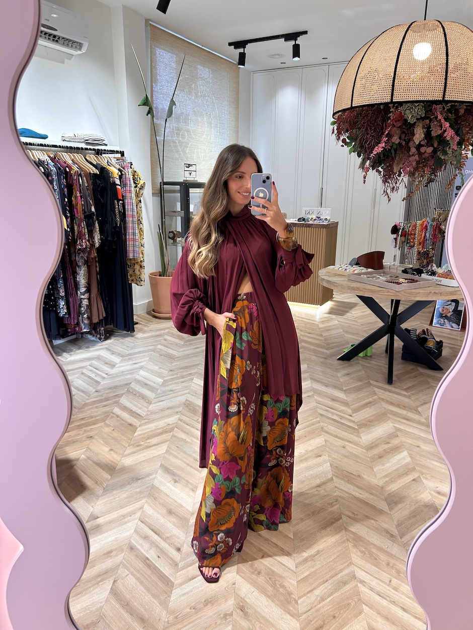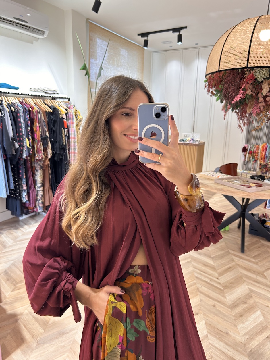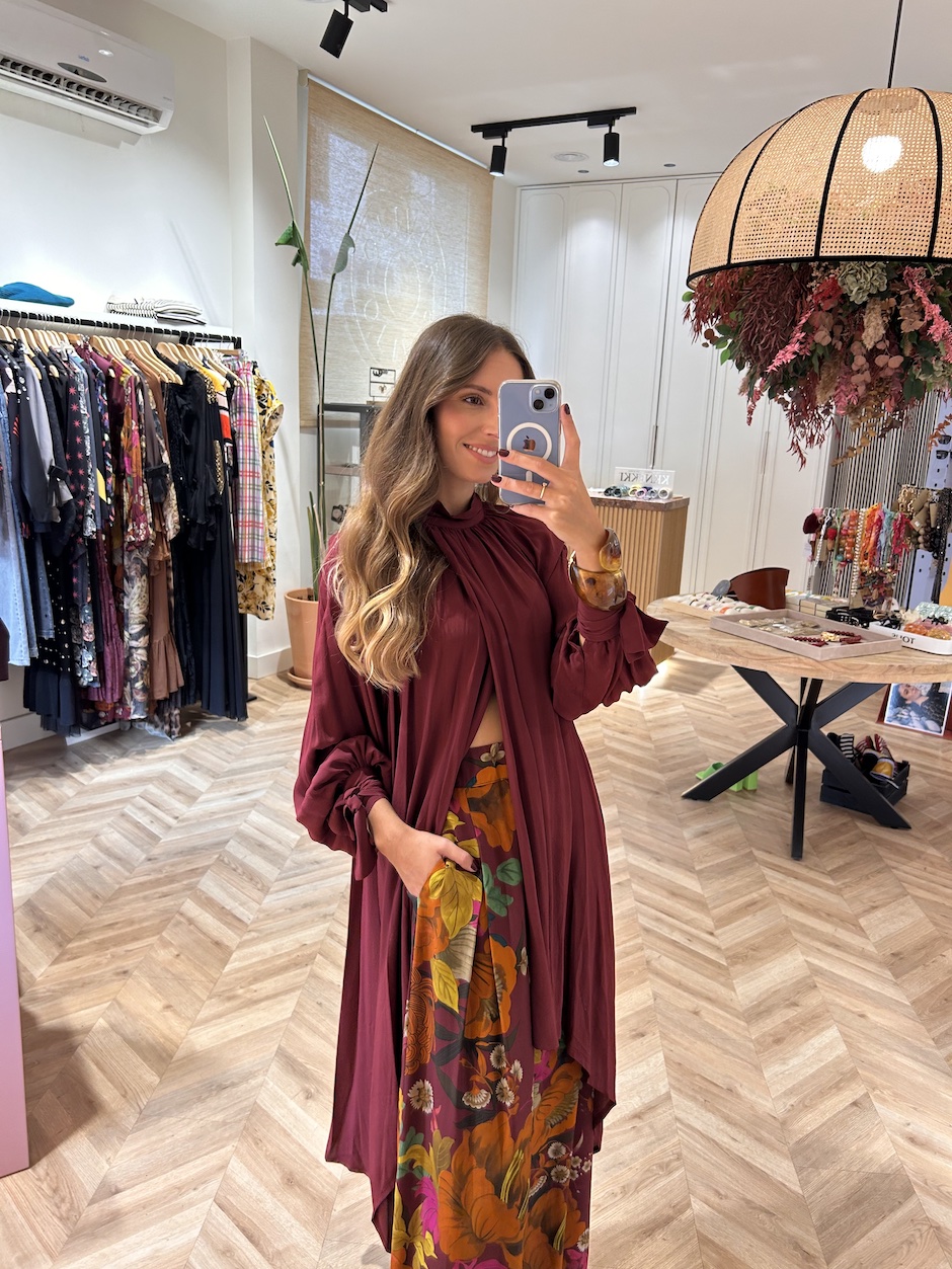 Blusón largo asimétrico con cuello perkins con fruncido y manga larga acabada en puño con cierre de lazada. Detalle de abertura en delantero. Cierre en espalda con botones.
