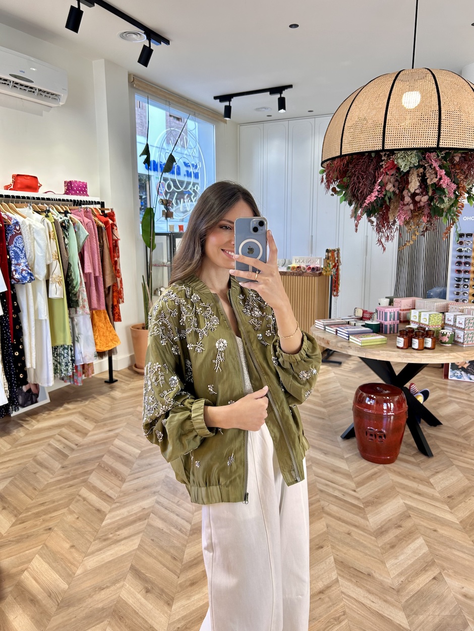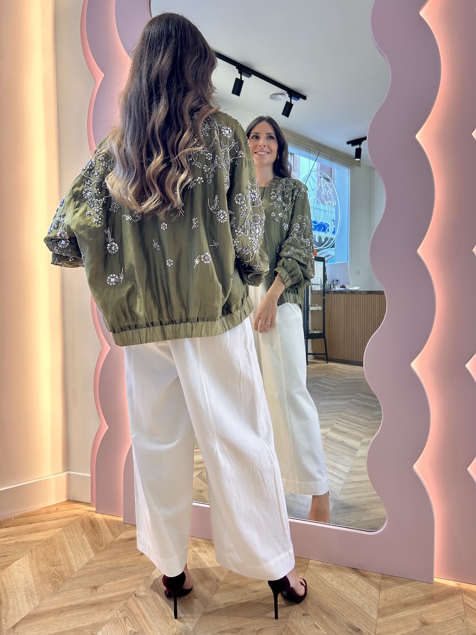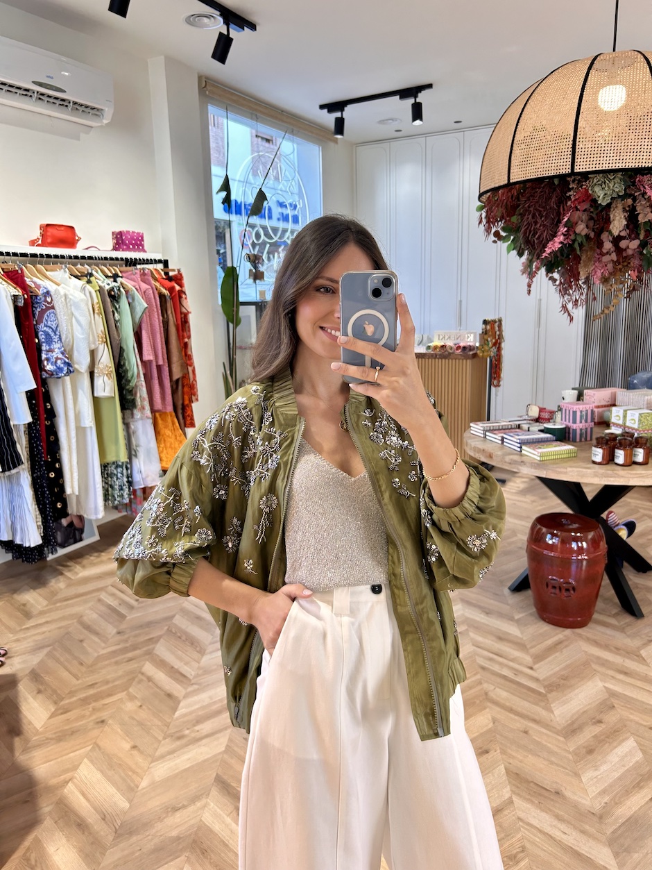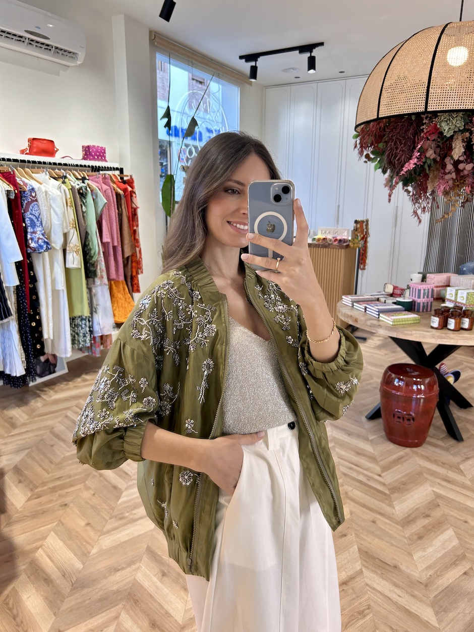 Bomber satinada con aplicaciones de pailletes en forma de flores. Cuello mao fruncido y manga larga acabada en puño elástico. Cierre en delantero con cremallera. Bajo fruncido con elástico.