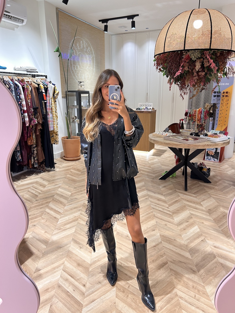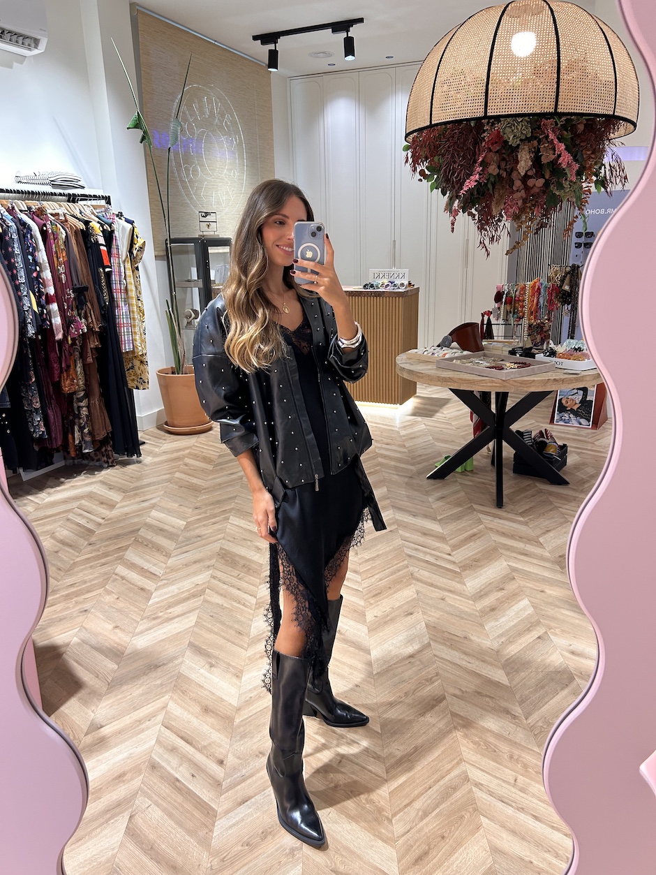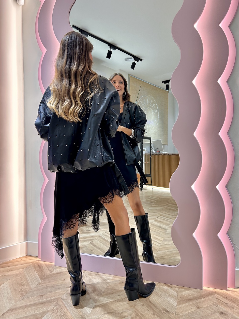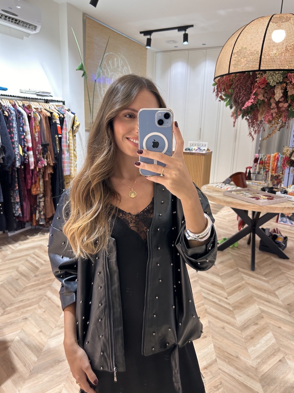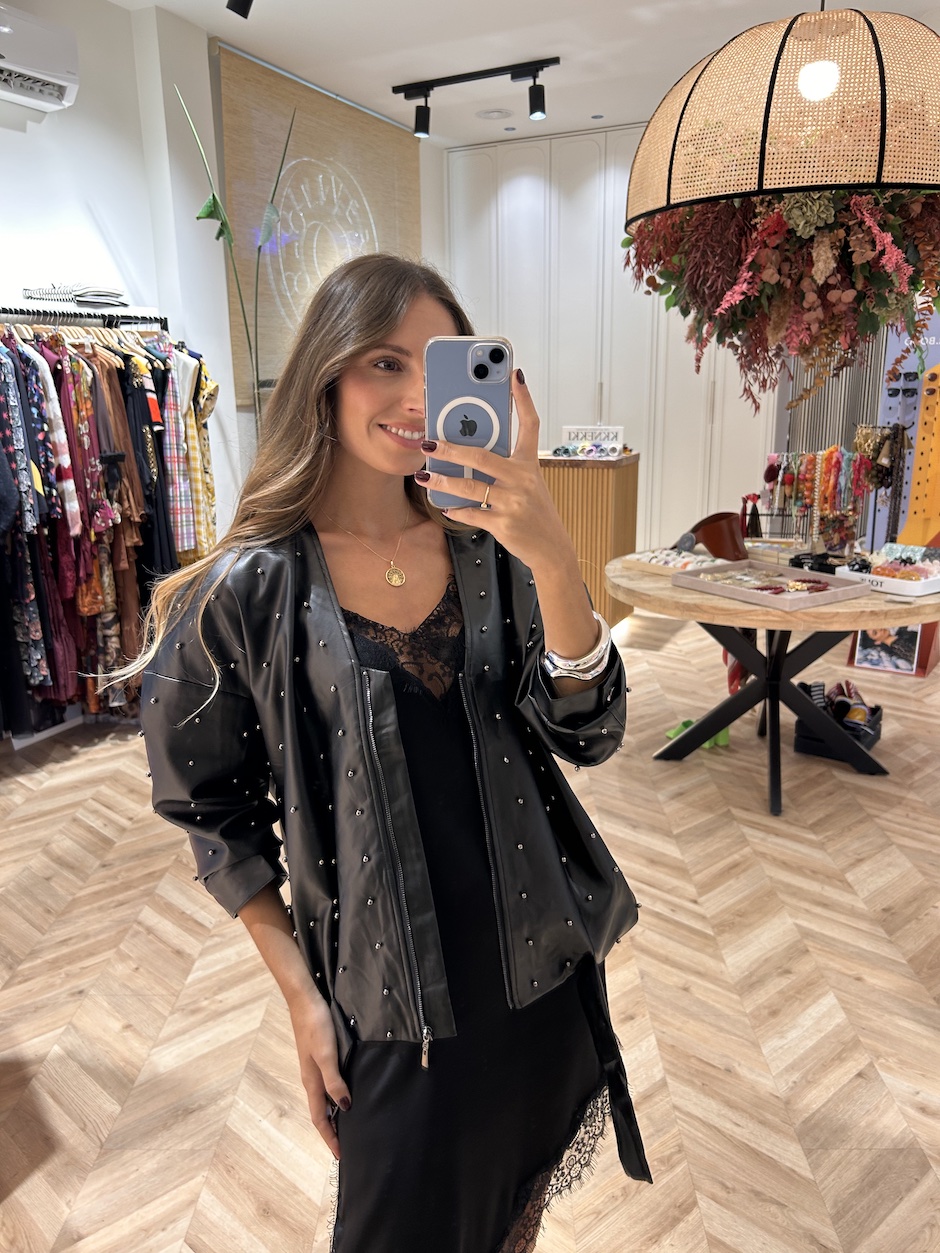 Cazadora de ecopiel con detalle de tachas. Sin cuello y manga larga acabada en puño con cierre de botón de clip. Cierre en frontal con cremallera. Bolsillos en laterales con cierre de cremallera. Bajo abullonado con cierre de hebilla. Lleva forro.