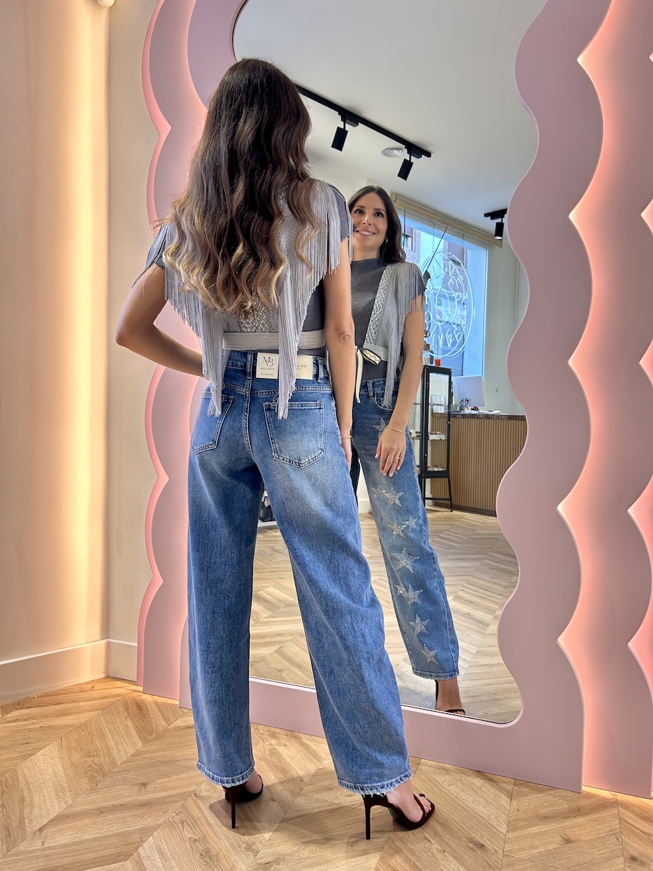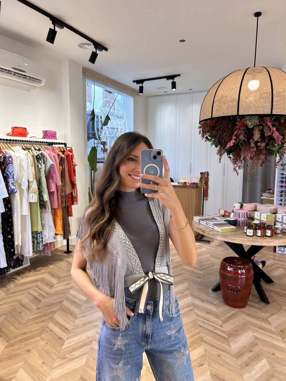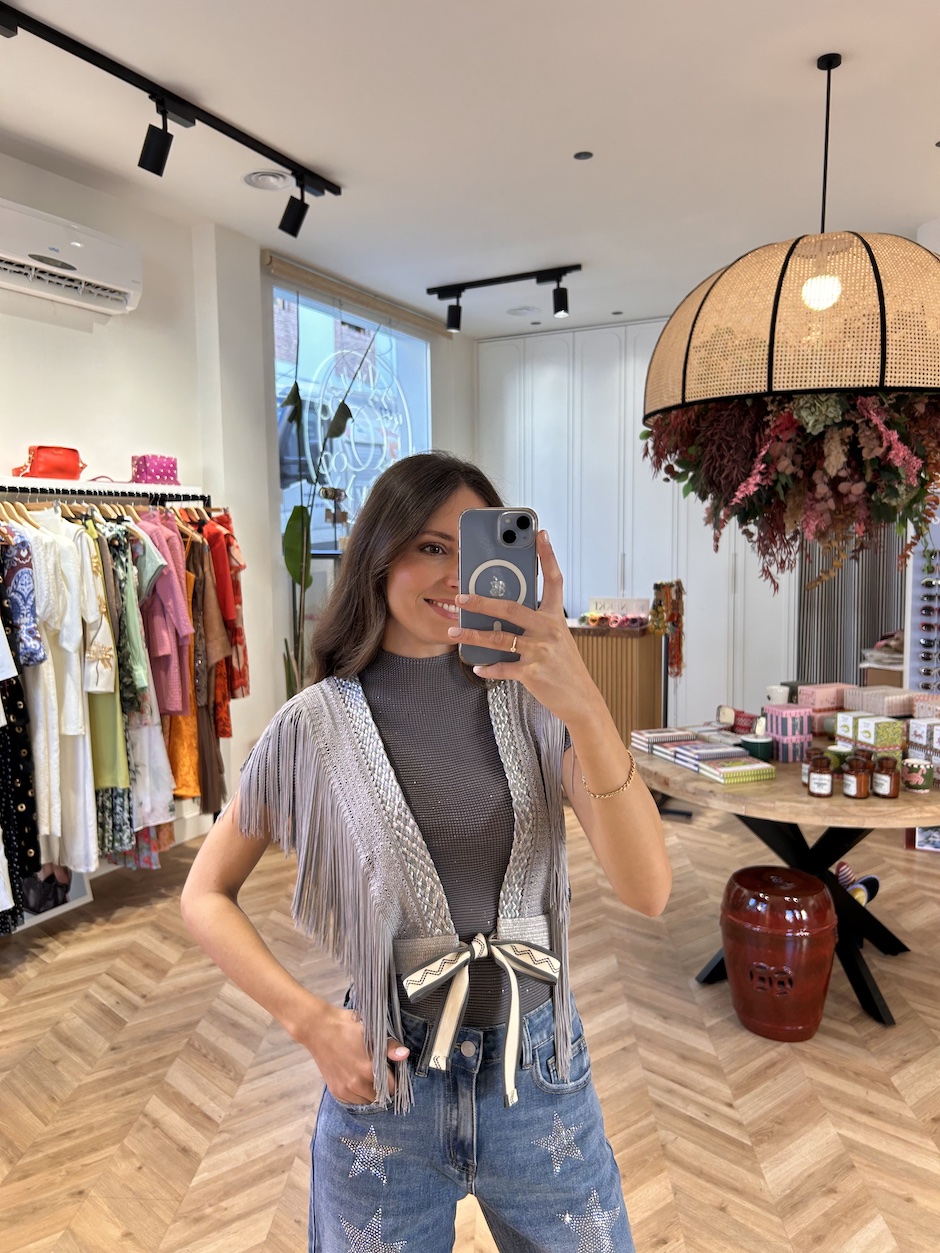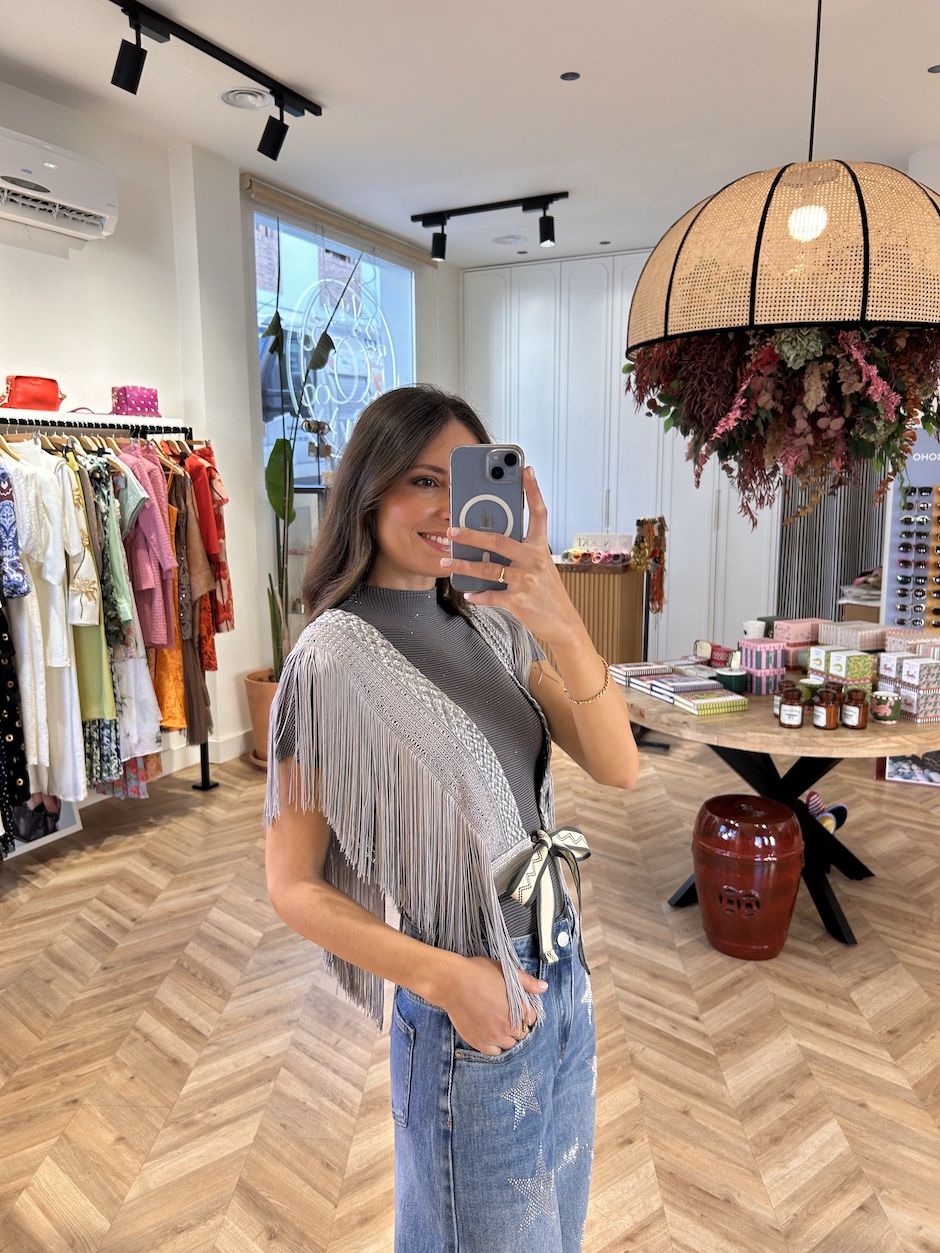 Chaleco arnés, con tirantes de pasamanería trenzada de fibra natural, en color gris y plata. Detalle de flecos de seda en tirantes. Cintura con elástico. Cierre en delantero con lazada.