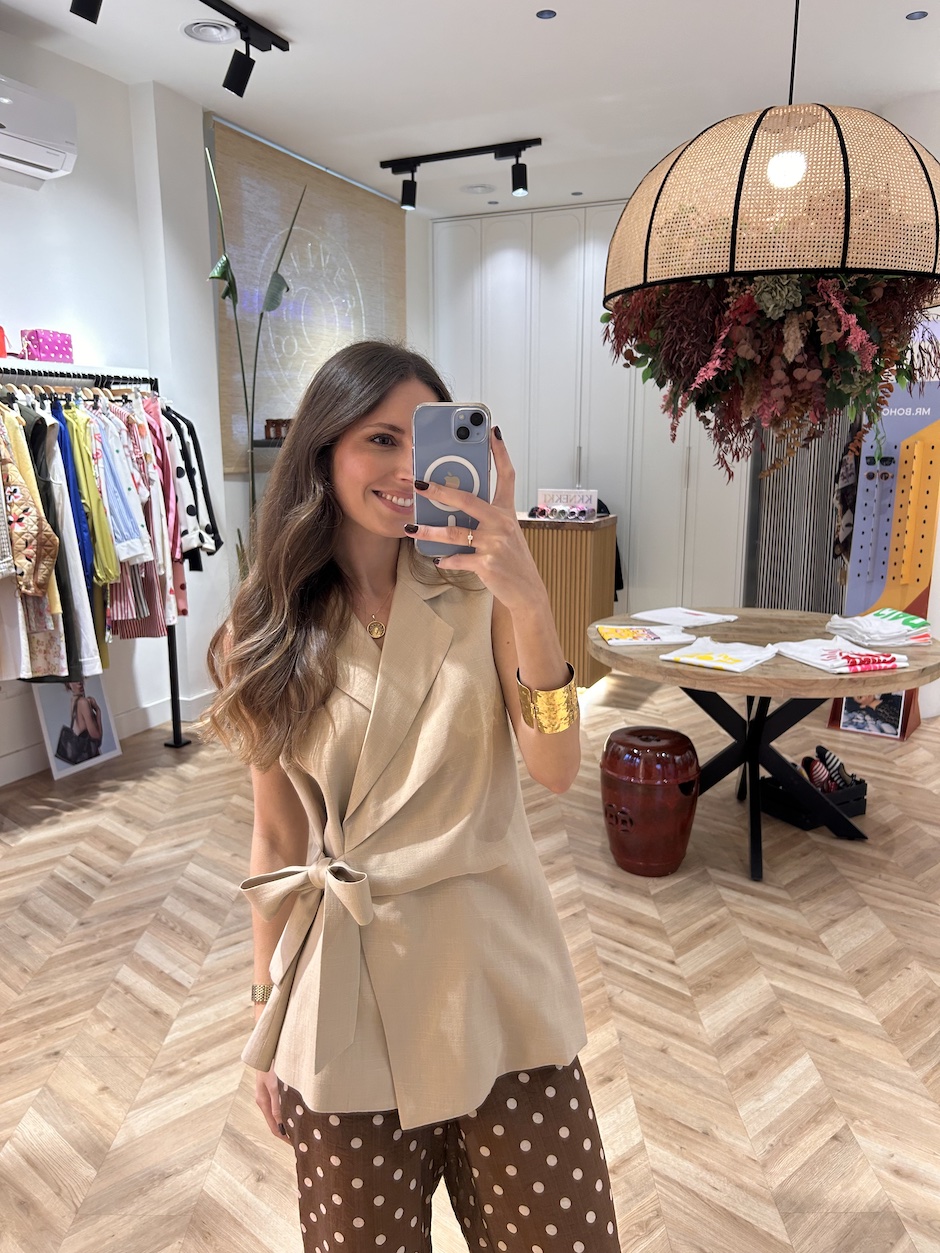 Chaleco cruzado con pinzas en delantero. Cuello solapa y manga sisa. Cierre en lateral con botón en interior y lazada del mismo tejido.