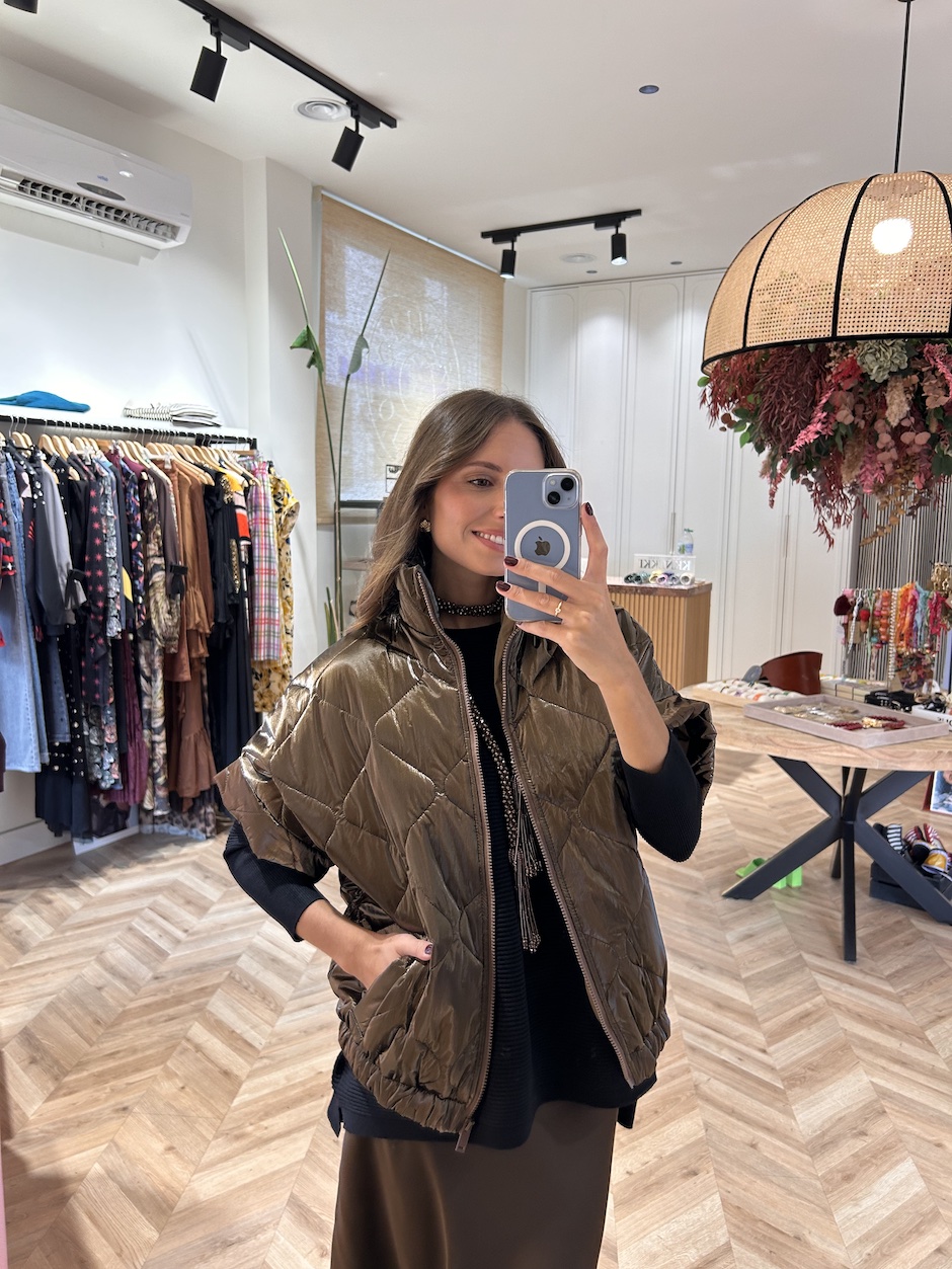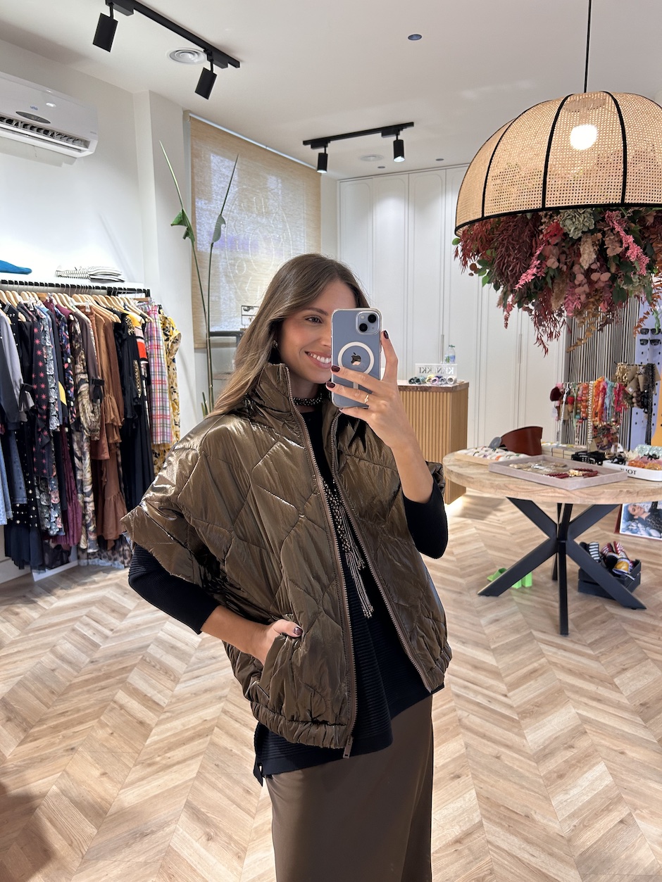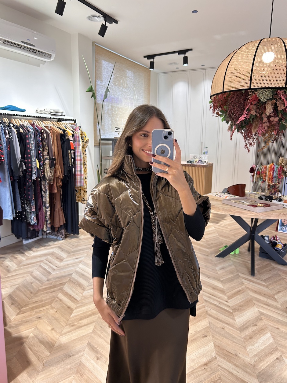 Chaleco plumífero acolchado, satinado. Con cuello perkins y manga corta. Cierre en frontal con cremallera. Bolsillos en laterales. detalle de elástico en el bajo. Lleva forro. Súper ligero, no pesa nada.
