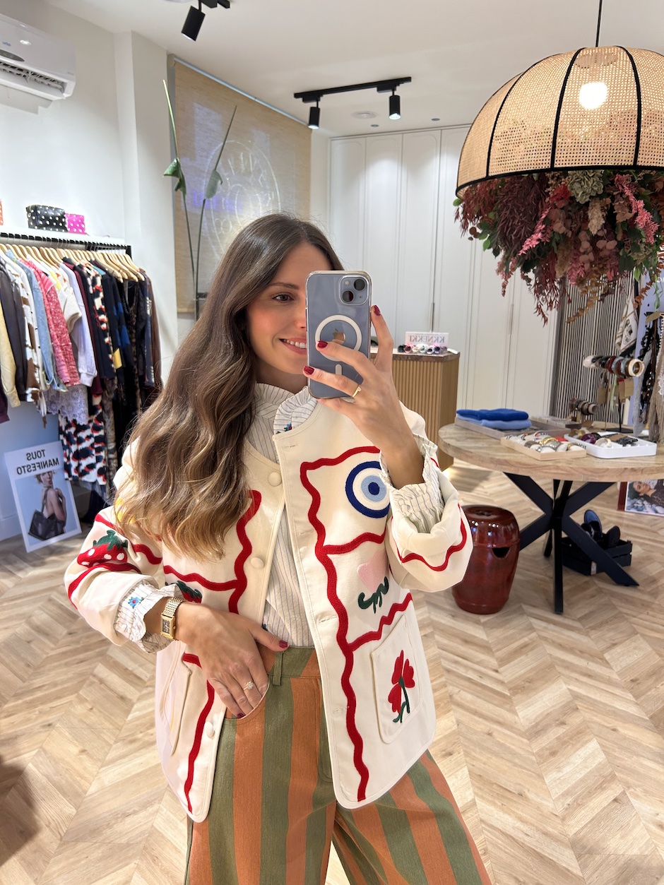 Chaqueta de lona con bordados, con cuello redondo y manga larga. Cierre en delantero con botones del mismo tejido. Bolsillos de parche en delantero. Lleva forro.
