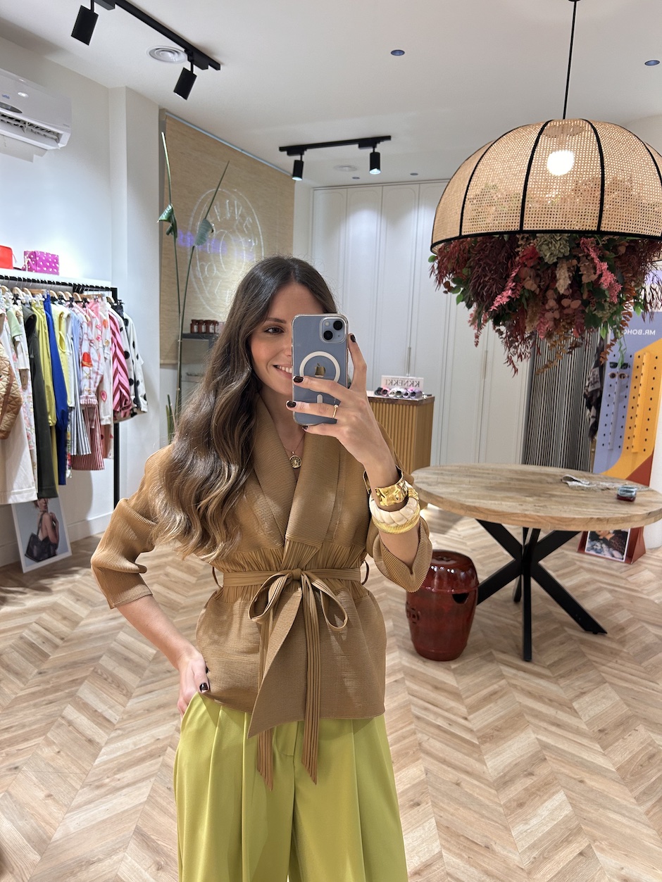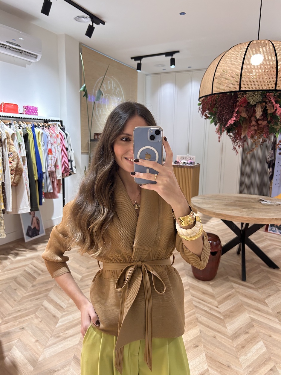 Chaqueta plisada con cuello solapa y manga francesa. Corte en la cintura. Cierre con cinturón del mismo tejido.