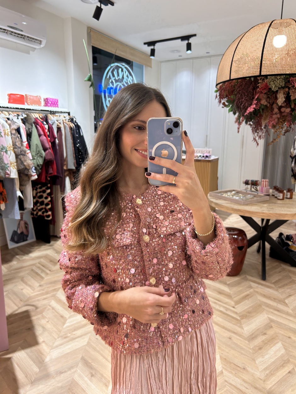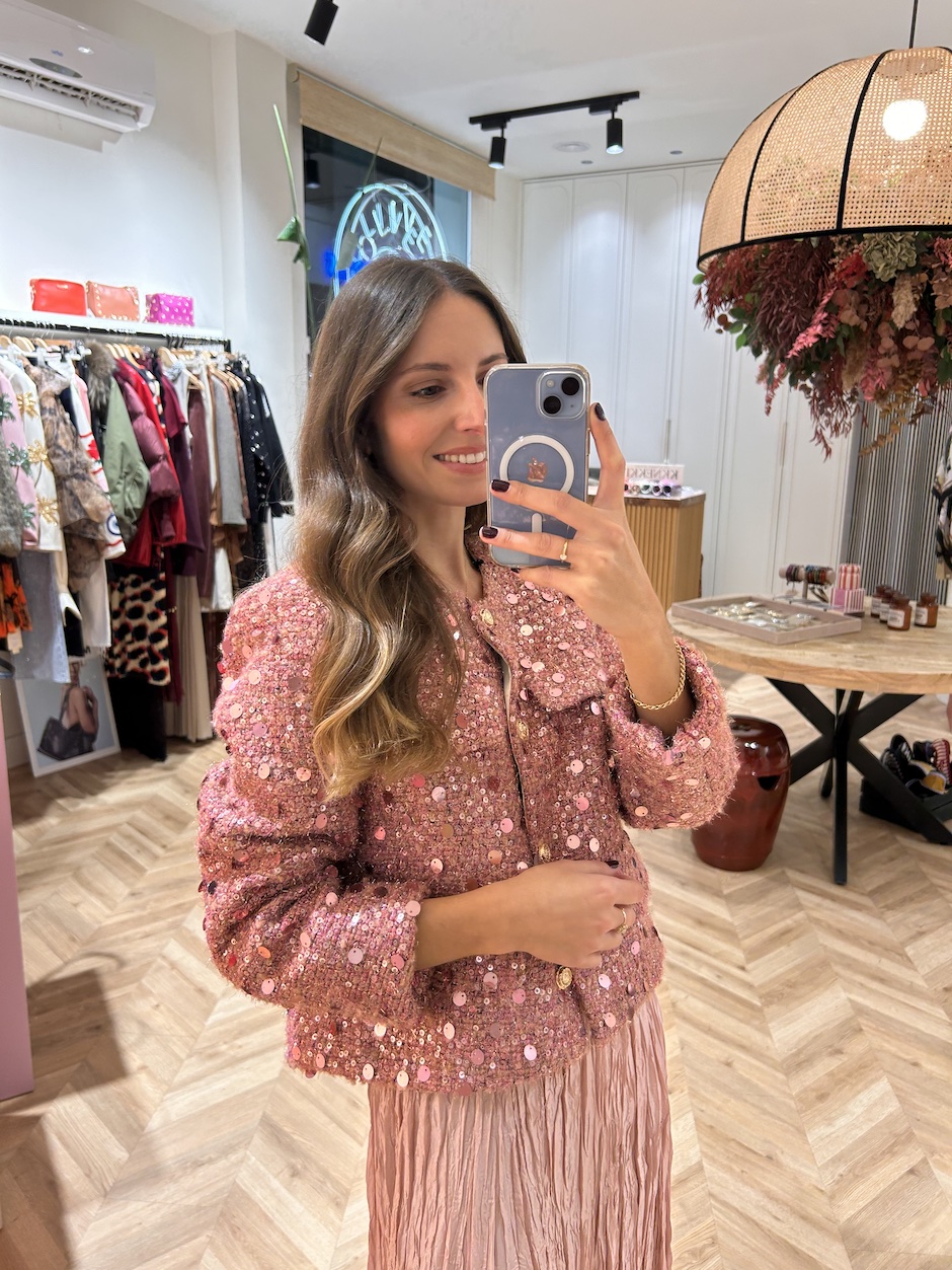 Chaqueta de tweed con aplicaciones de lentejuelas. Cuello redondo y manga larga. Cierre en frontal con botones. Falsos bolsillos de solapa en delantero. La chaqueta lleva un acolchado de plumífero por dentro.