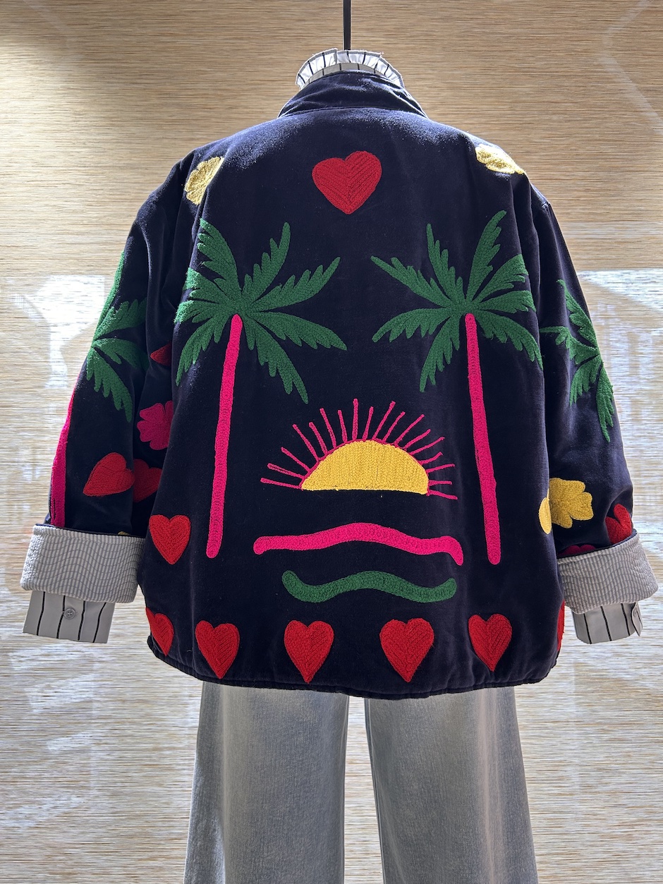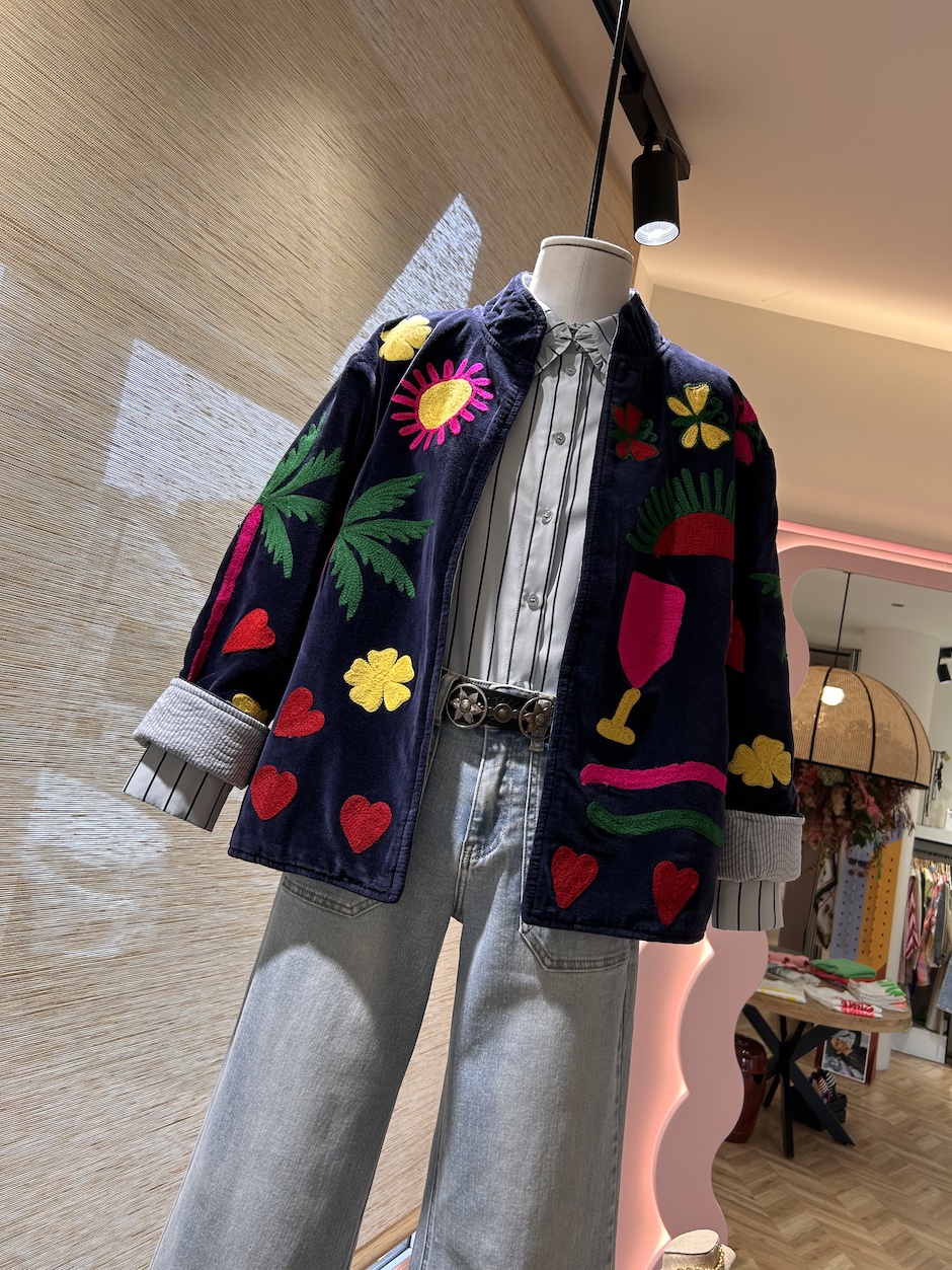 Chaqueta de terciopelo bordada, con cuello mao y manga larga. Bolsillos en laterales. Forro de algodón con estampado de rayas azul y blanco.