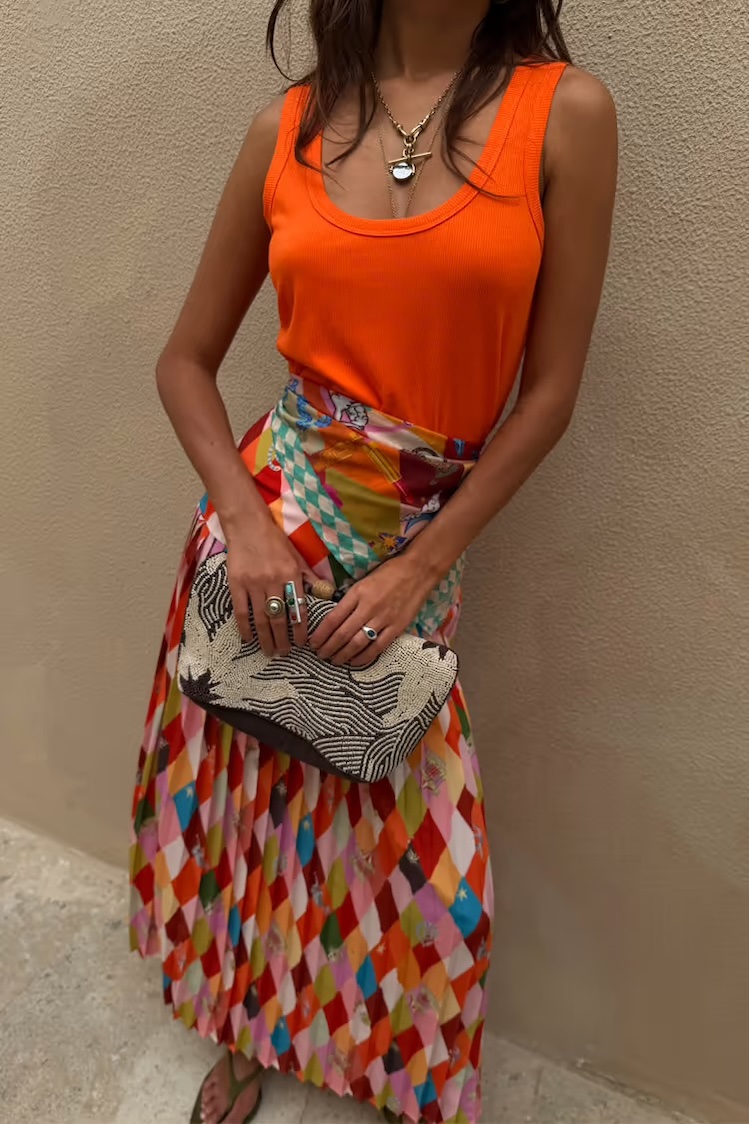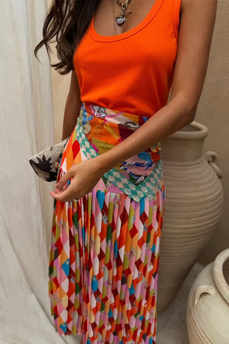 Falda larga plisada de talle alto con cinturilla. Corte en la cadera. Cierre en lateral con cremallera oculta en costura. estampado geométrico brillante y audaz lleno de rayas de colores brillantes y audaces y con motivos de nuestra gama de circo.