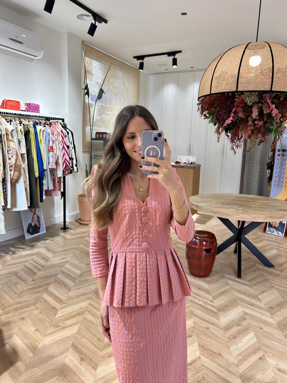 Conjunto dos piezas de top y falda. Top con cuello en V con hombreras y manga abullonada tres cuartos. Corte en la cintura con volante tableada. Falsos botones forrados del mismo tejido en delantero. Cierre en espalda con cremallera oculta en costura. Falda midi de talle alto con cinturilla. Cierre en espalda con cremallera oculta en costura. Abertura en espalda.