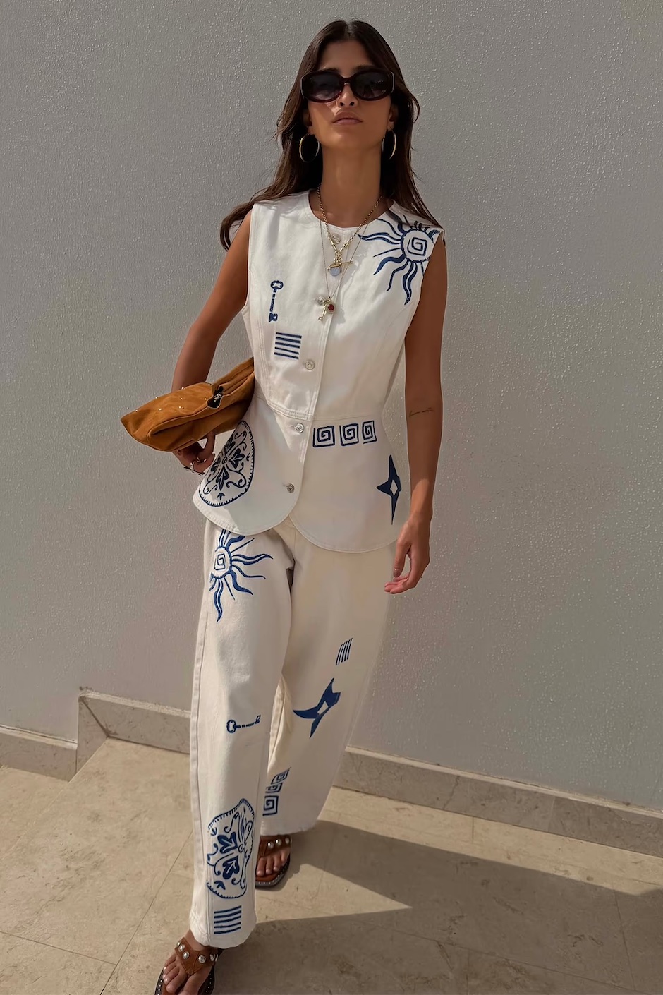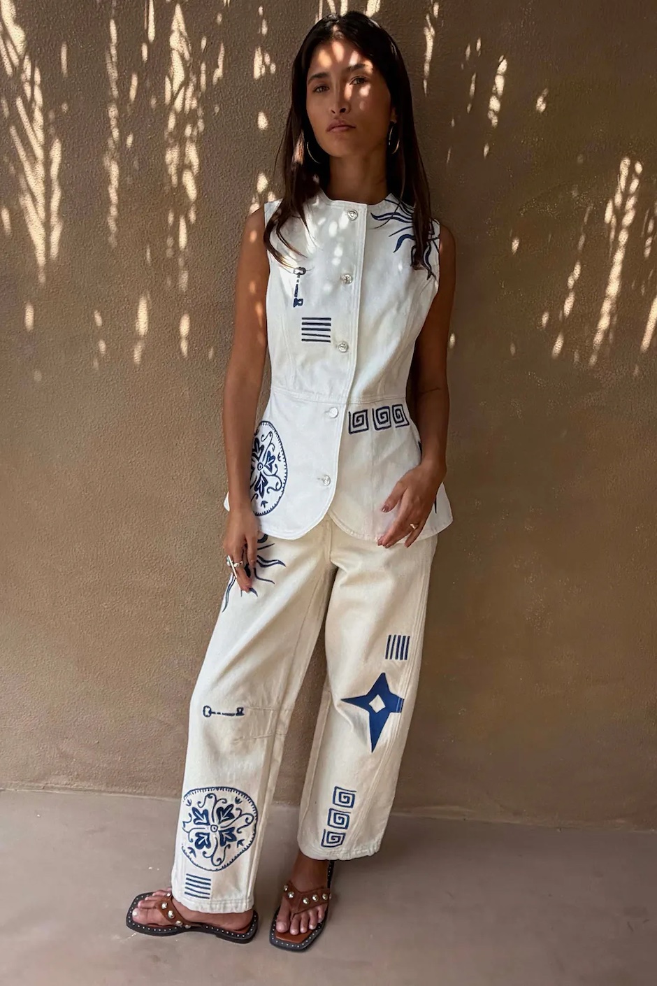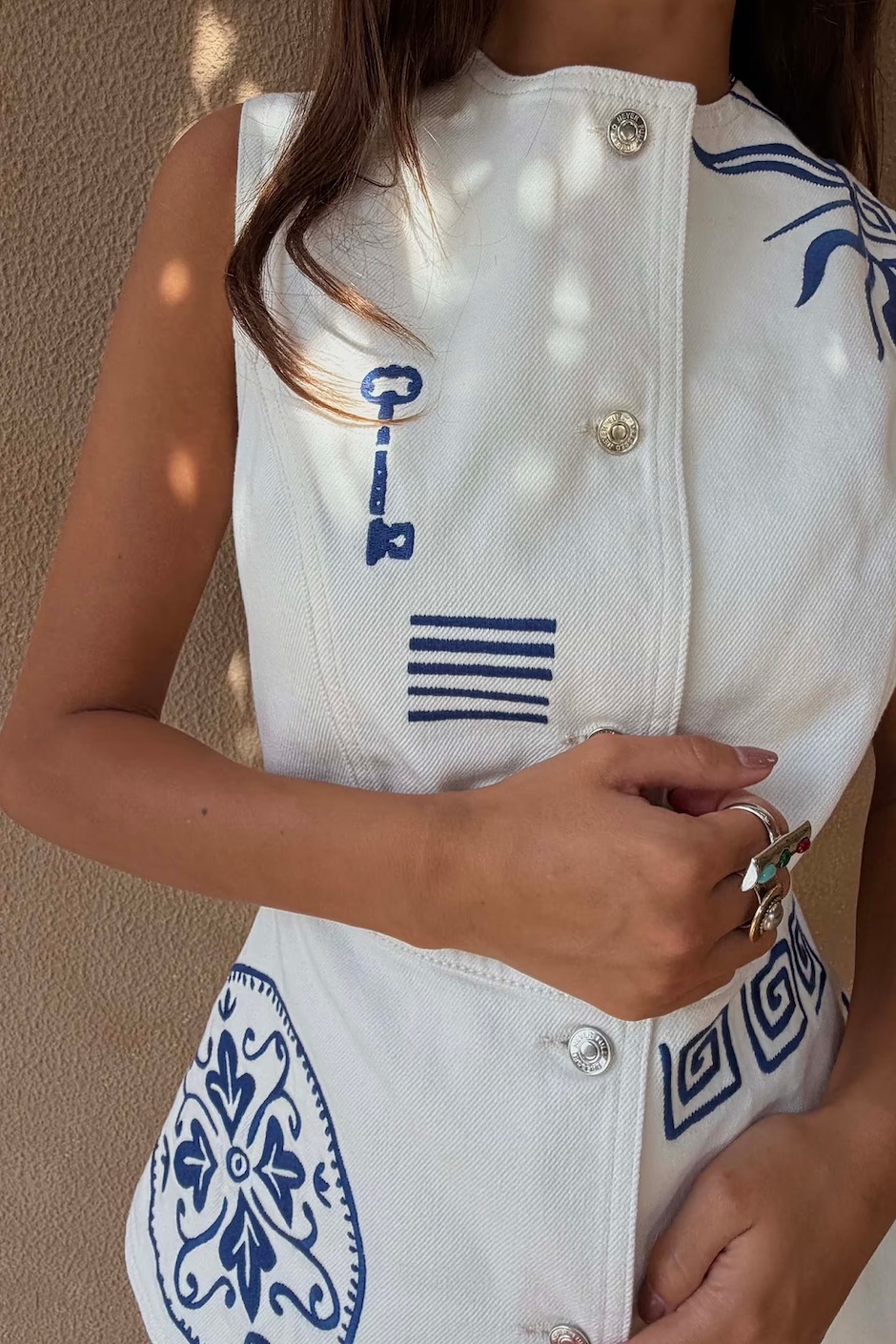 Chaleco vaquero con cuello redondo y manga sisa. Corte en la cintura. Cierre en frontal con botones. Detalle de bordado con nuestros icónicos motivos y gráficos solares que aportan elementos del arte griego, con botones grabados para añadir un elemento extra de textura.