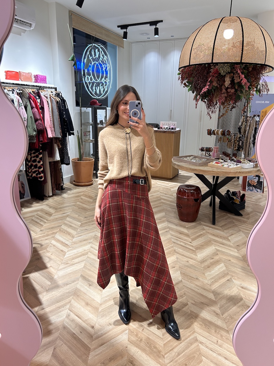 Falda de talle alto con costura asimétrica en cadera. Detalle de trabilla efecto piel en lateral. Cierre en espalda con cremallera oculta en costura. Bajo desflecado con picos asimétricos.