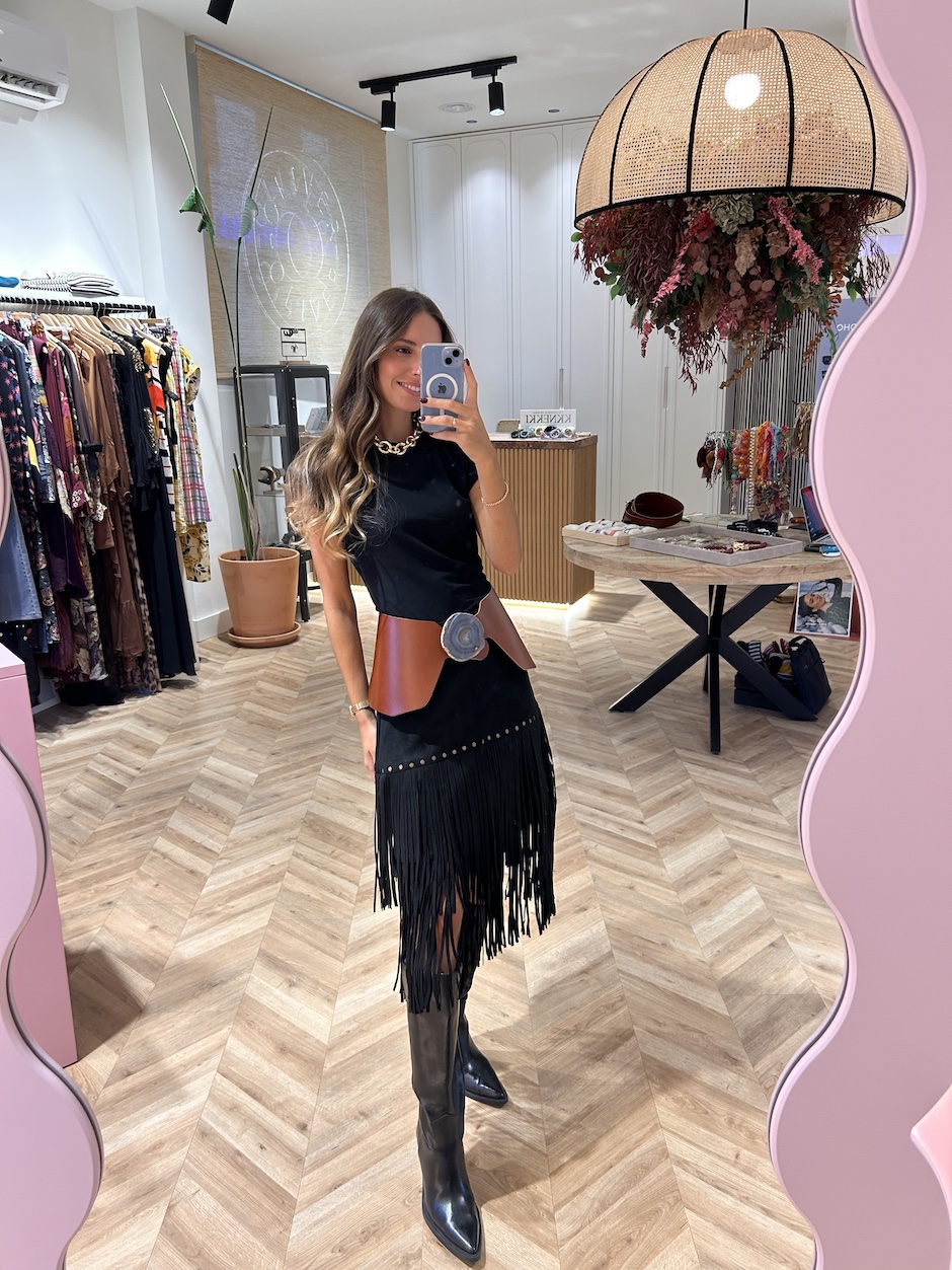 Falda de antelina con flecos. Detalle de tachas metálicas. Cierre en lateral con cremallera oculta en costura.