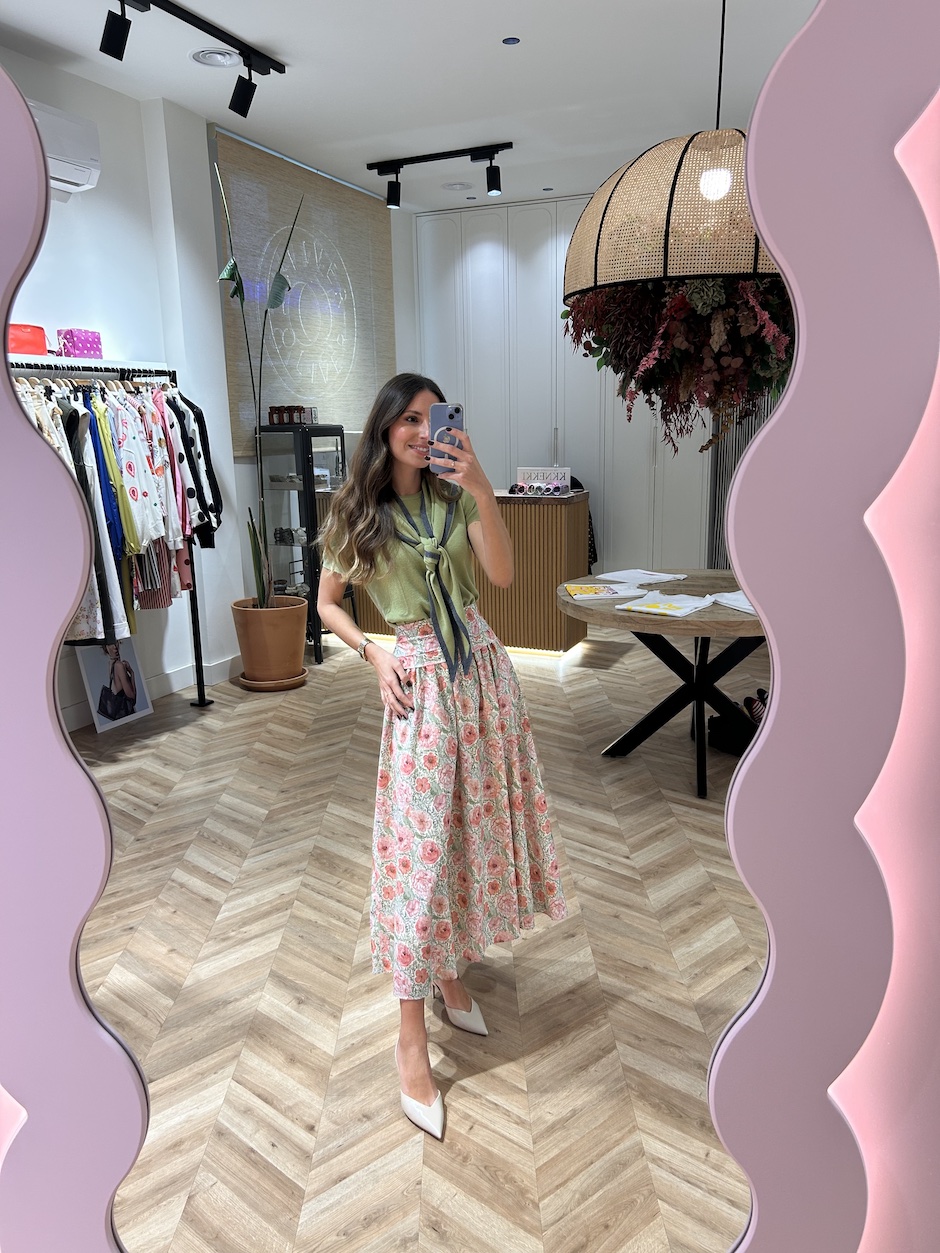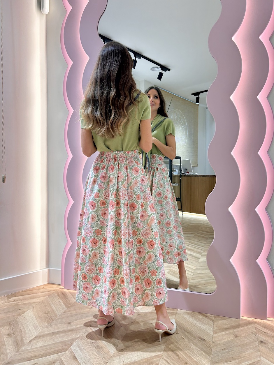 Falda larga de talle alto con elástico en la espalda. Detalle de jaretas en delantero. Corte en la cadera. Estampado floral.