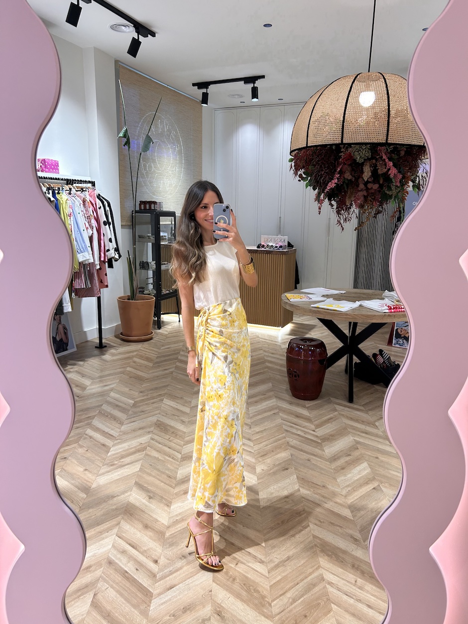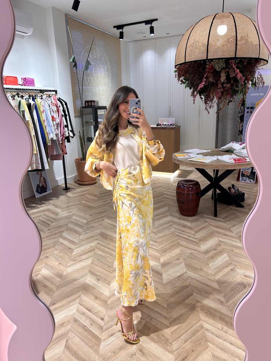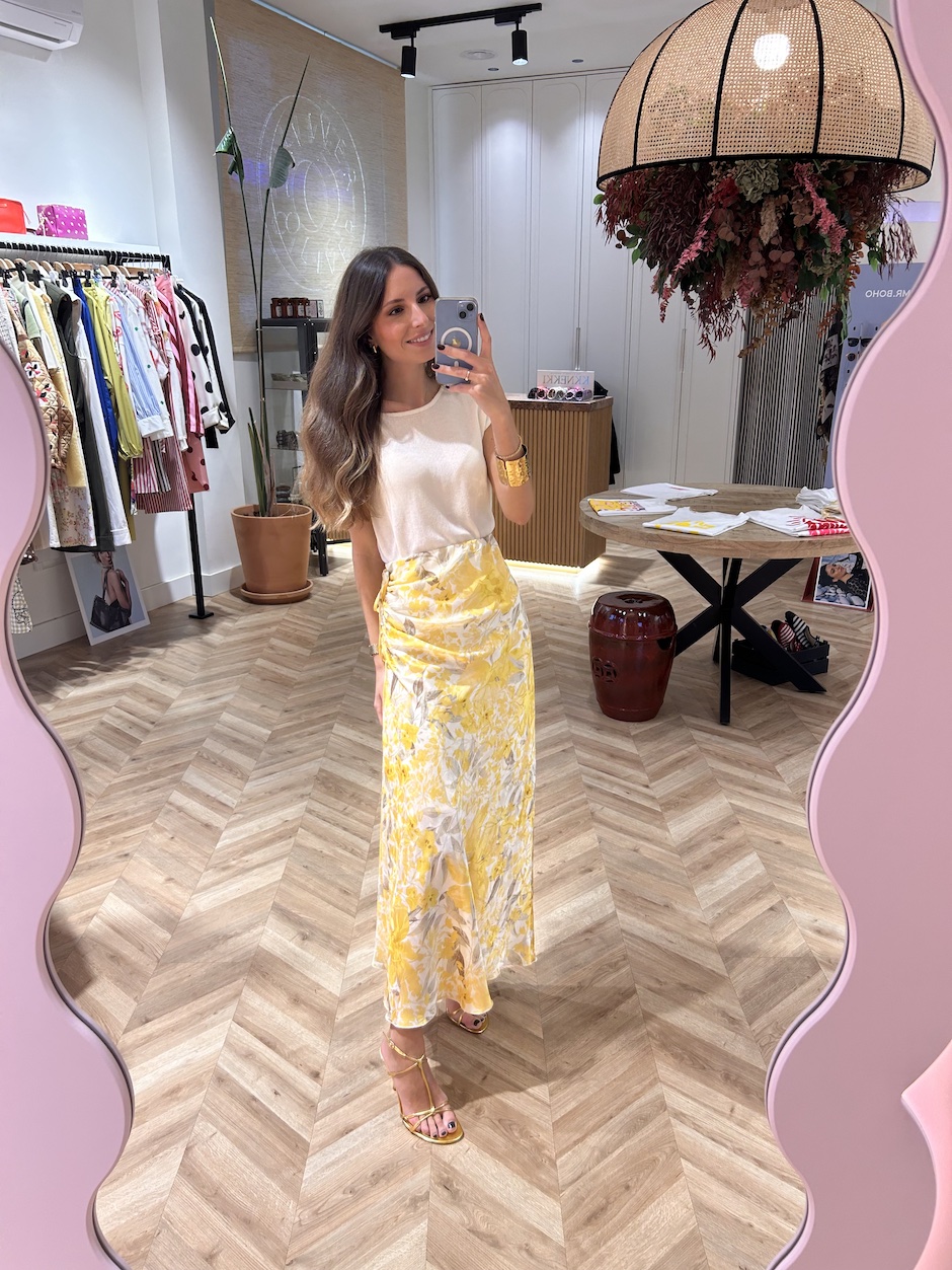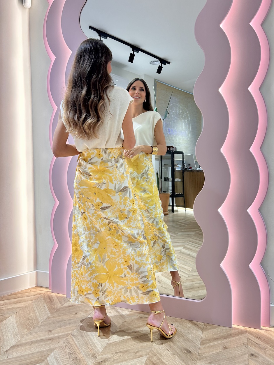 Falda larga satinada con cintura elástica. Detalle de fruncido en lateral, ajustable con lazada del mismo tejido. Estampado floral.