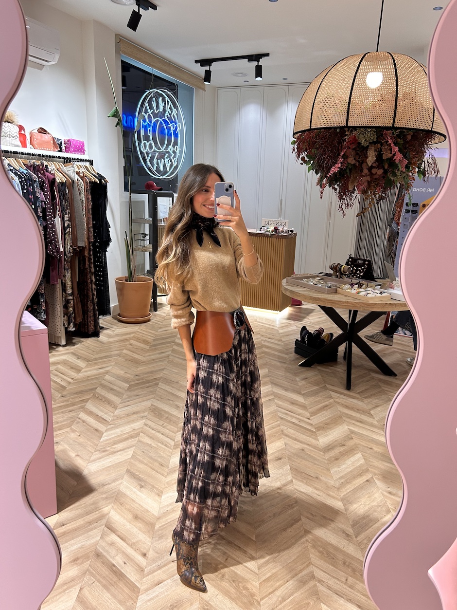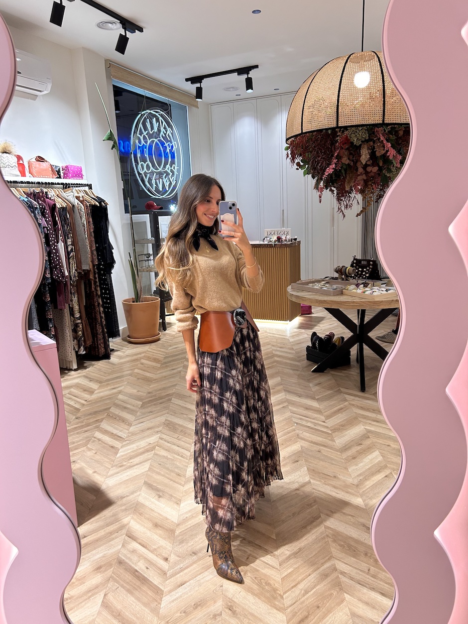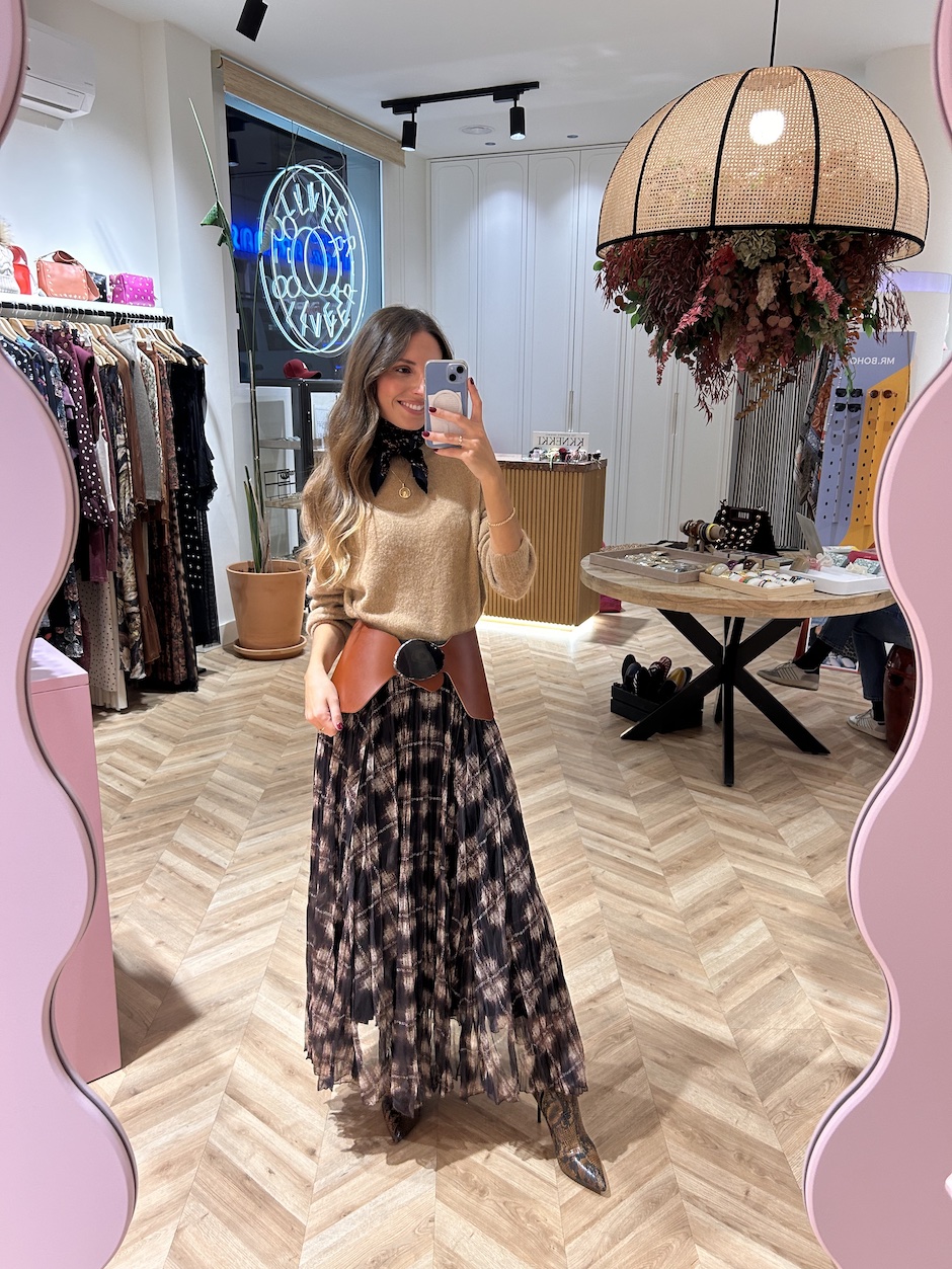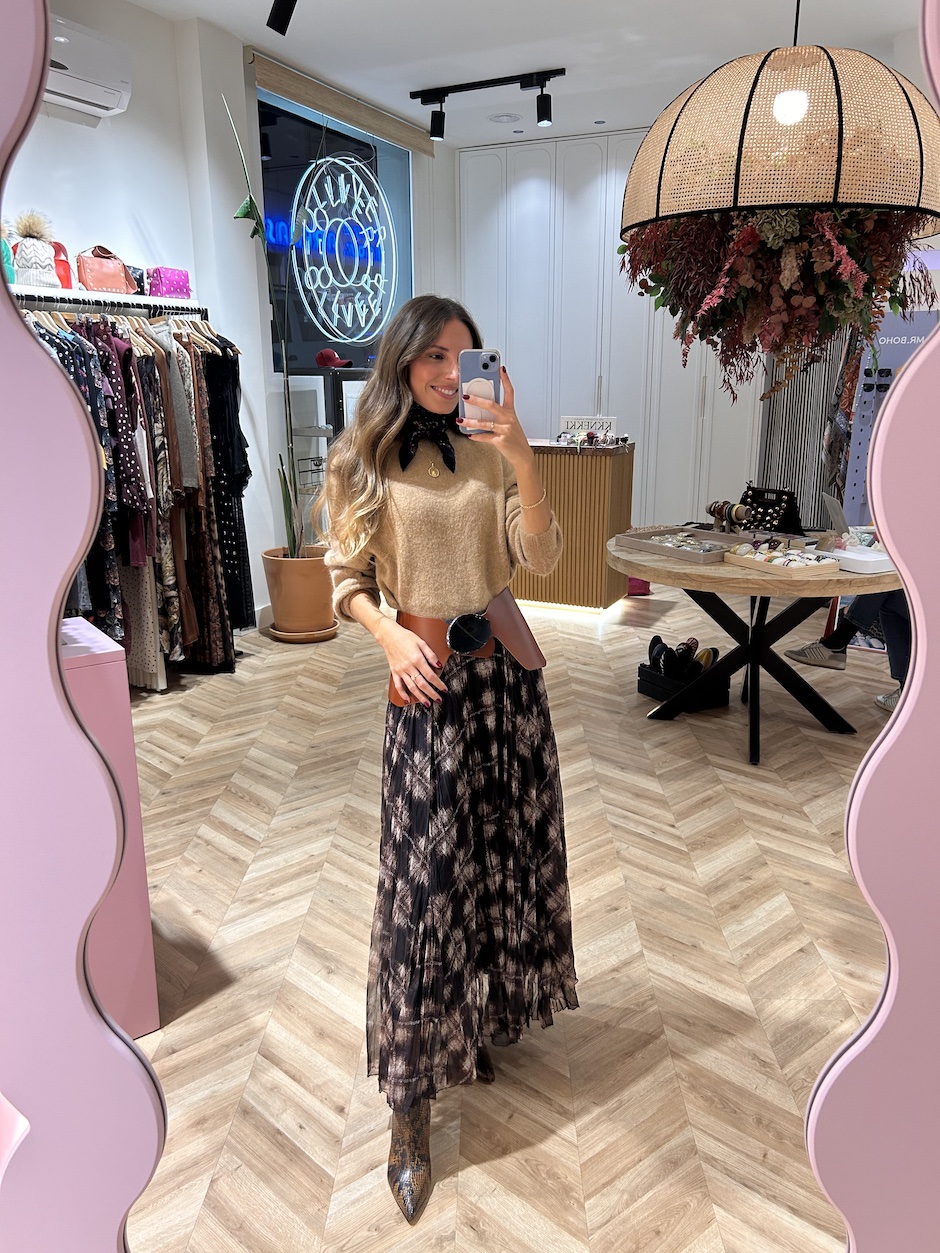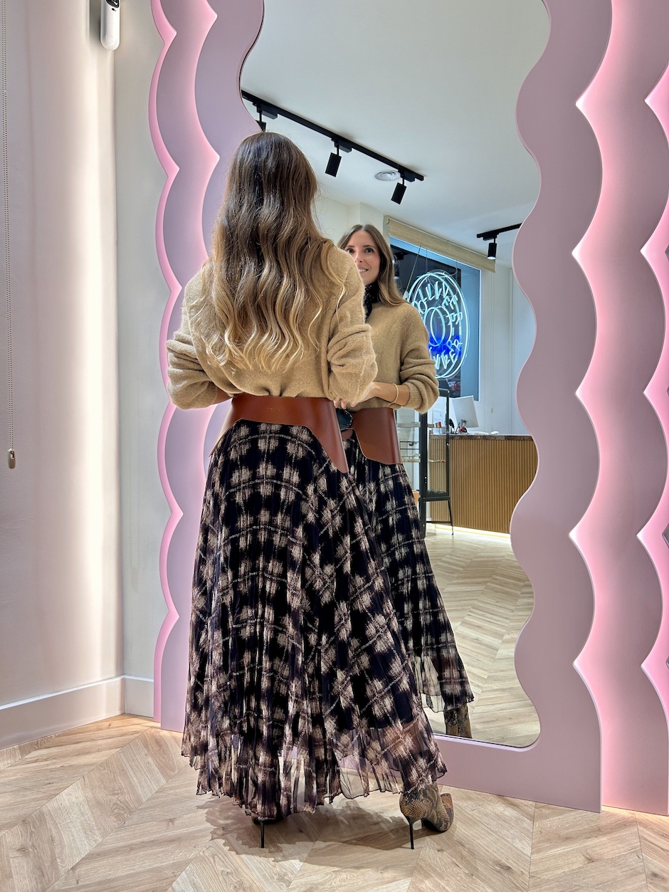 Falda larga de tul plisado con cintura elástica. Lleva forro. Estampado de cuadros chocolate y marfil.