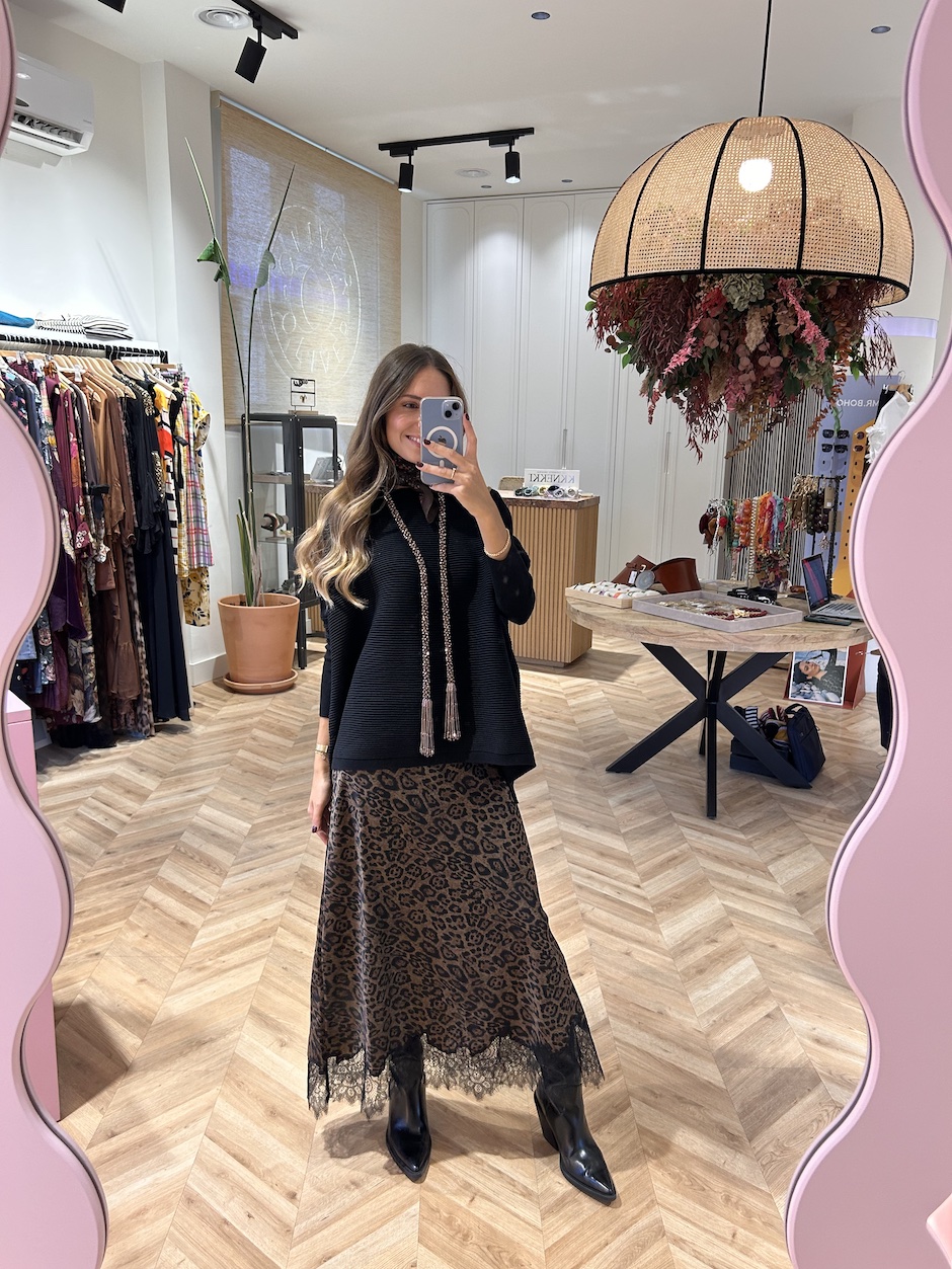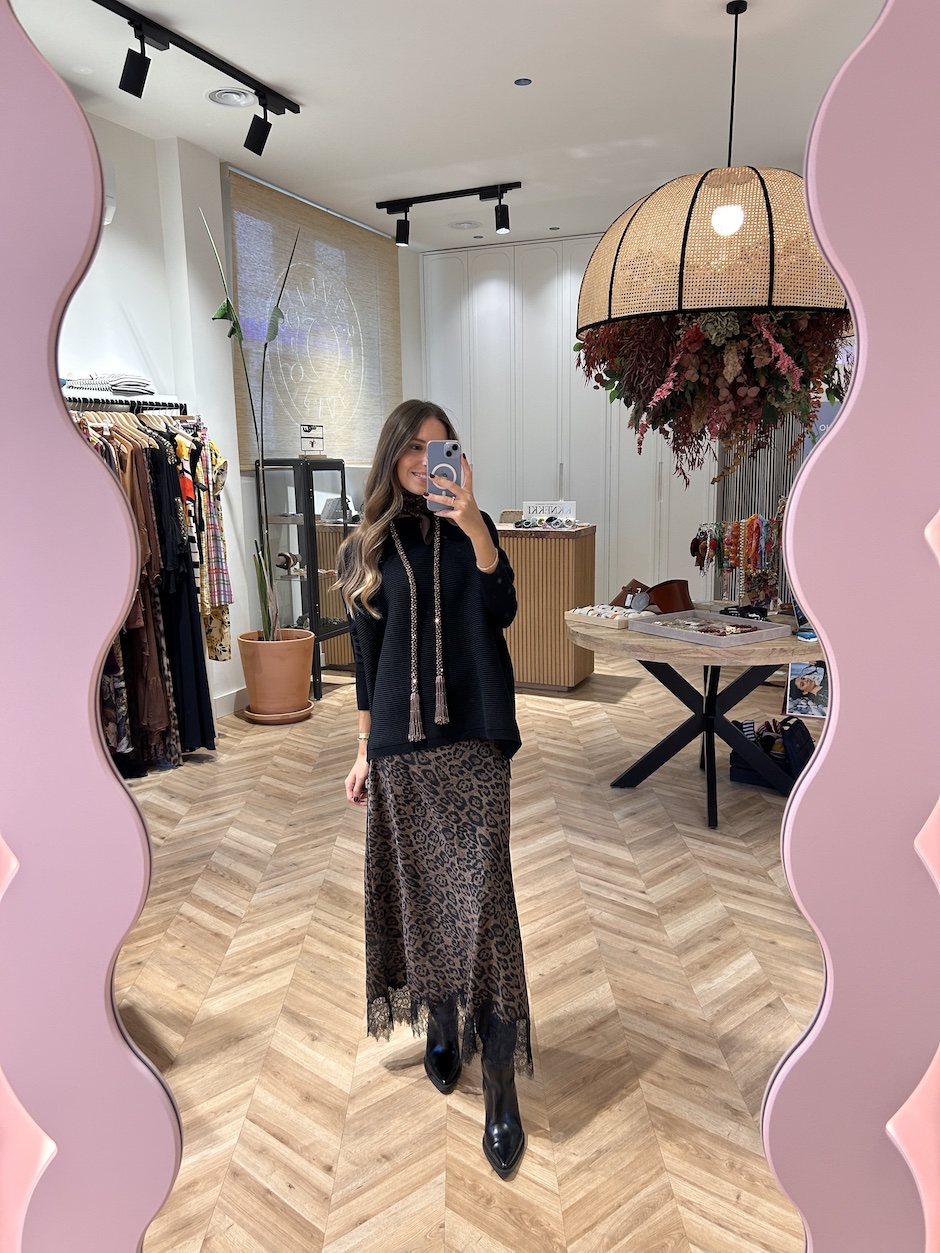 Falda lencera satinada con estampado animal. Cierre en lateral con cremallera oculta en cintura. Detalle de blonda de encaje en el bajo.