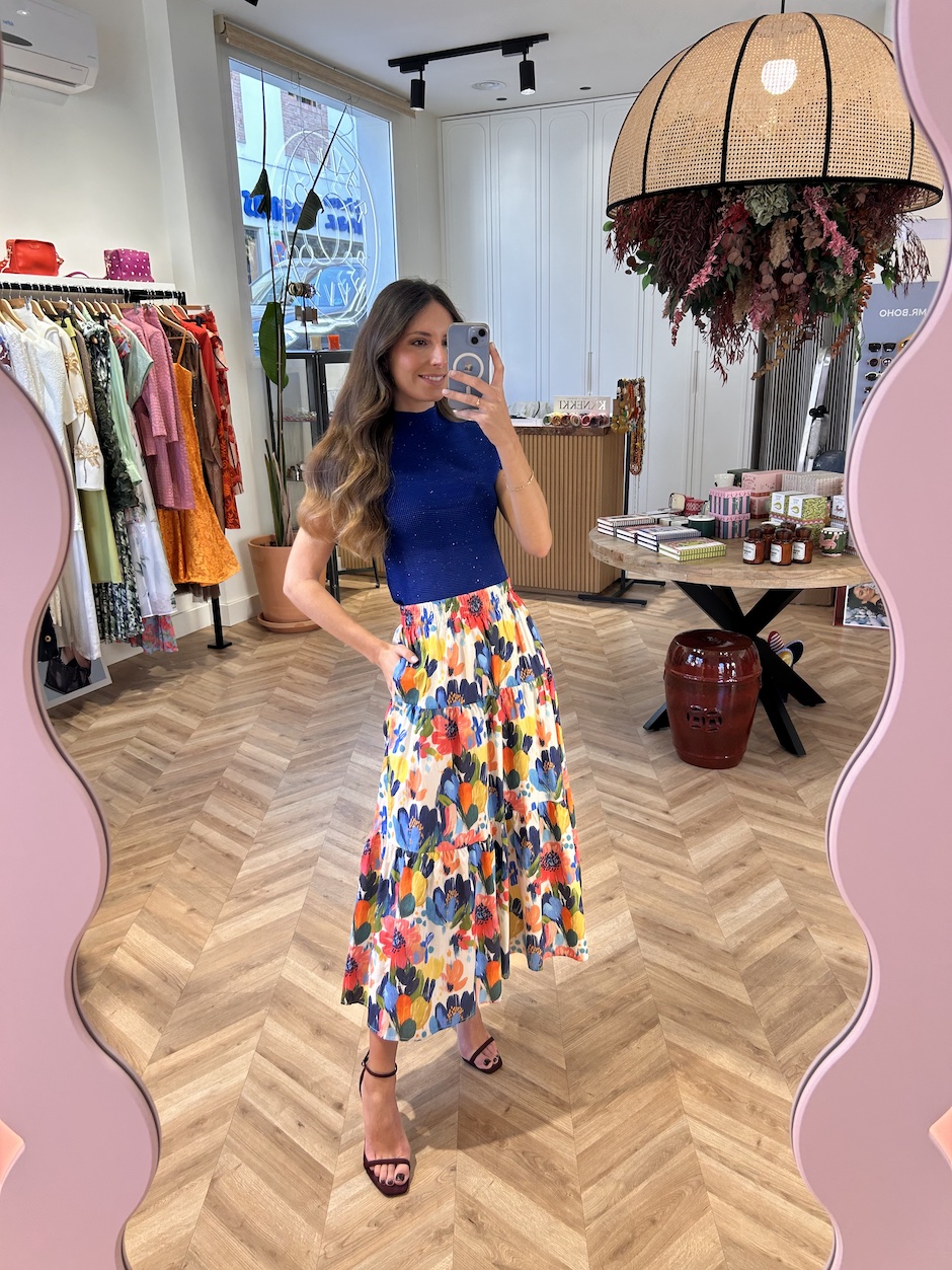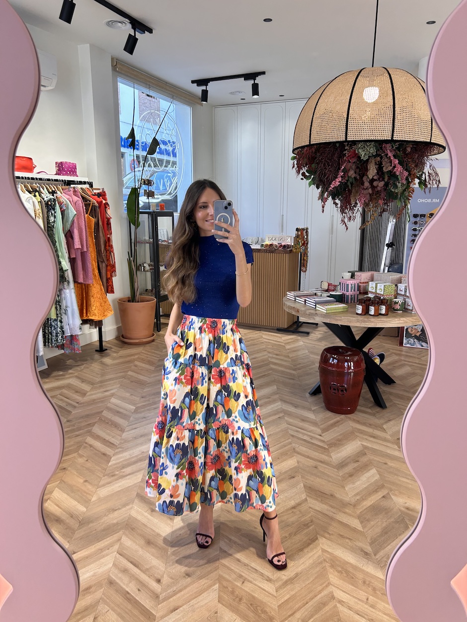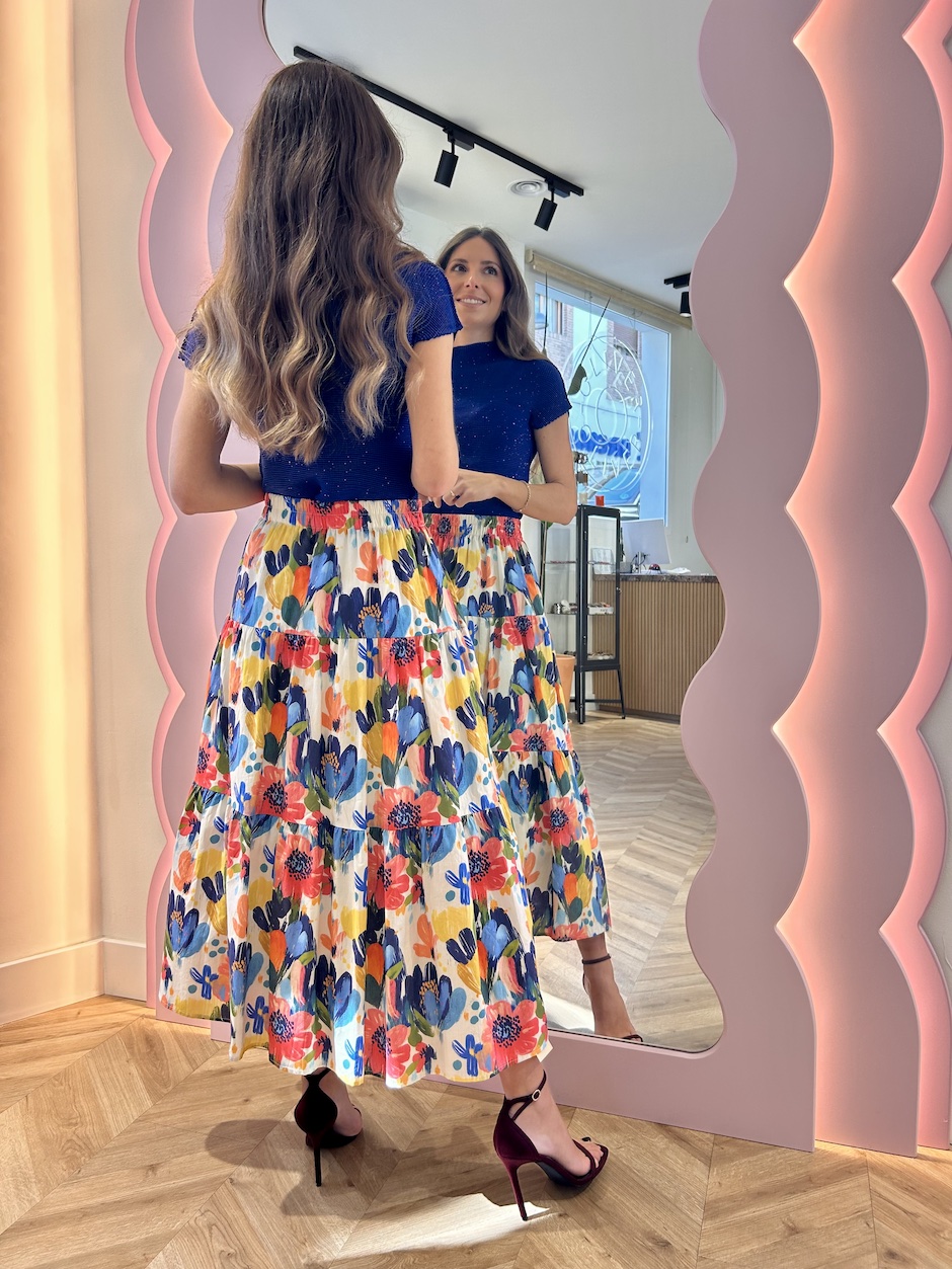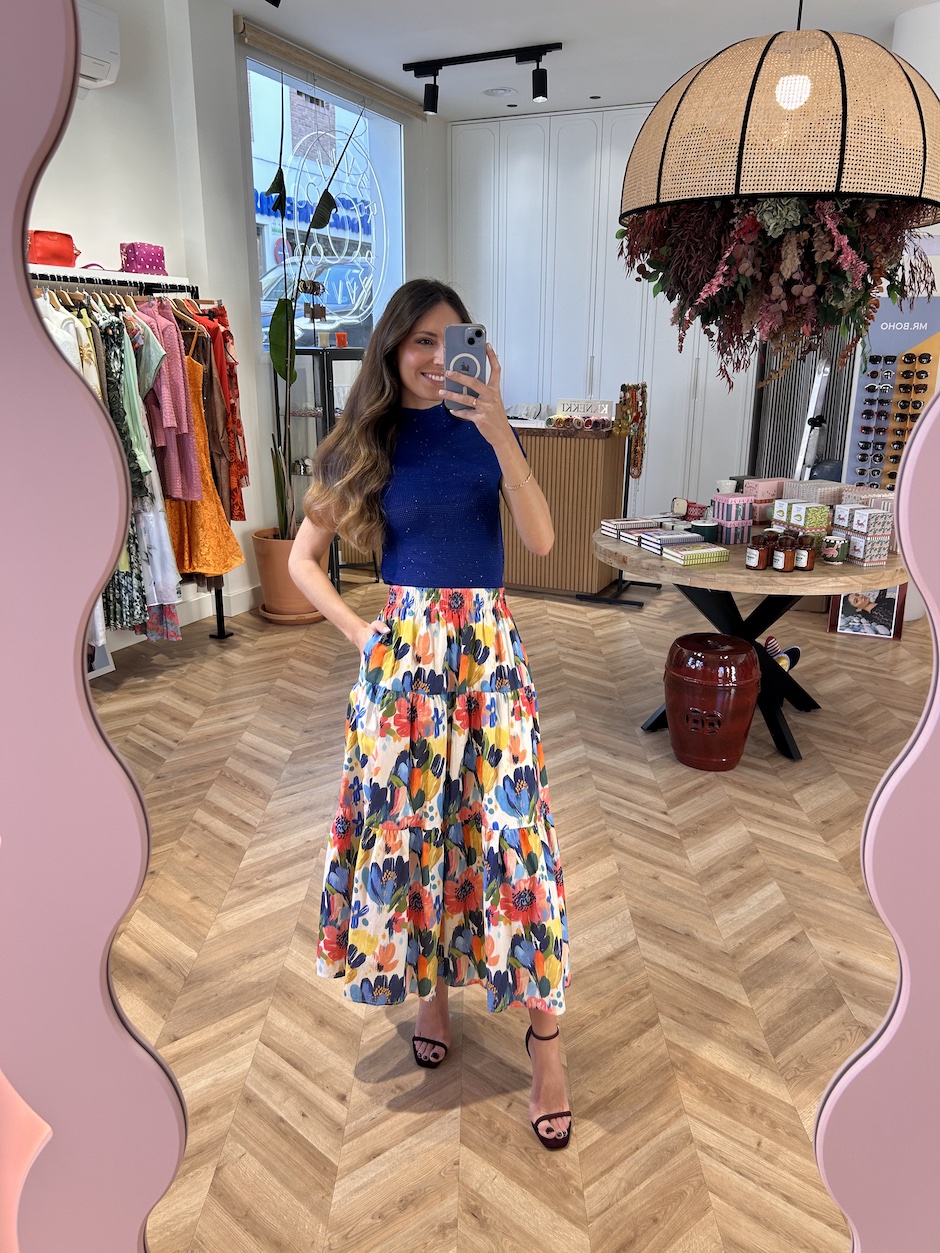 Falda midi con volante, con cintura elástica. Bolsillos en laterales. Estampado floral.