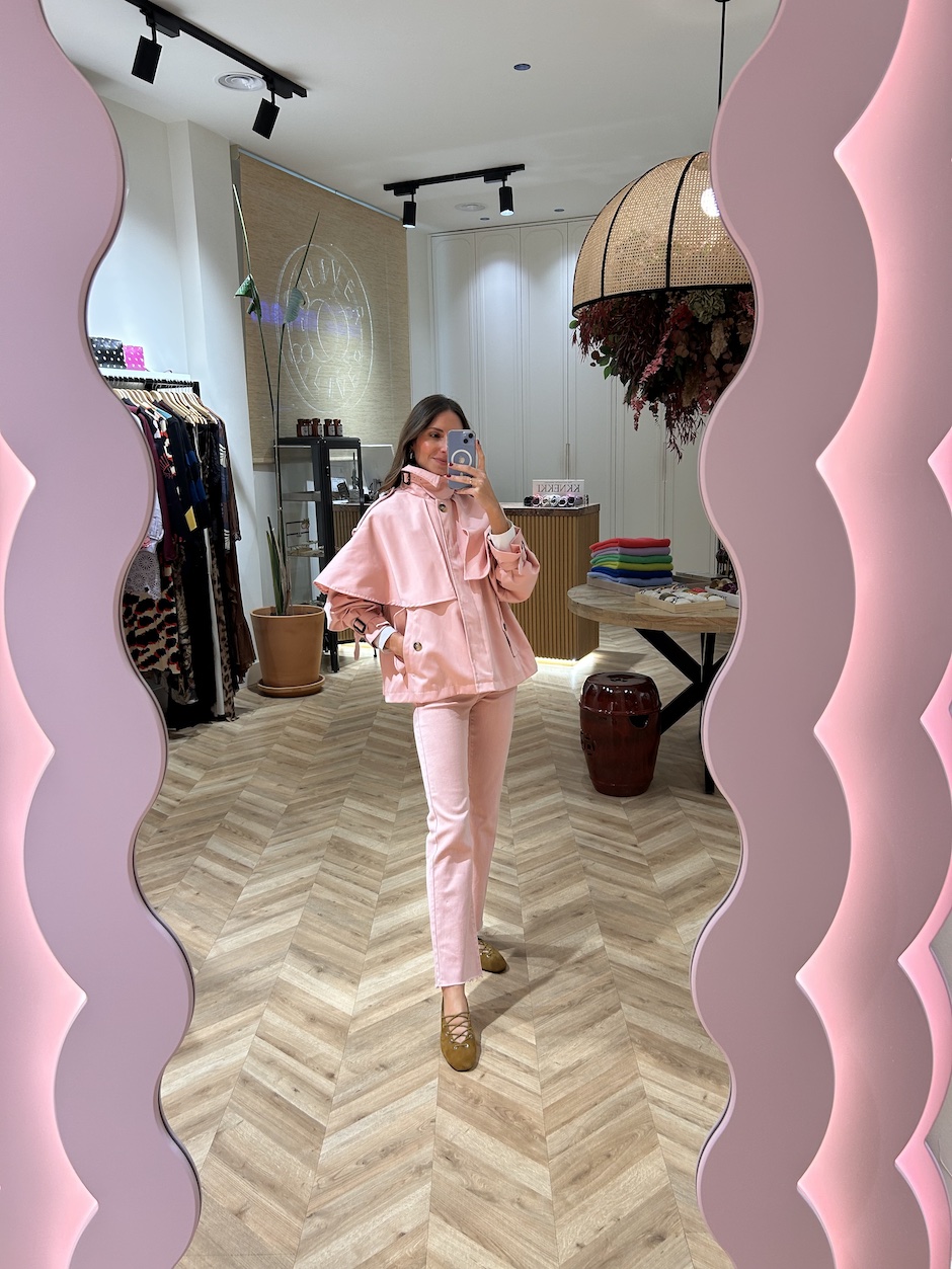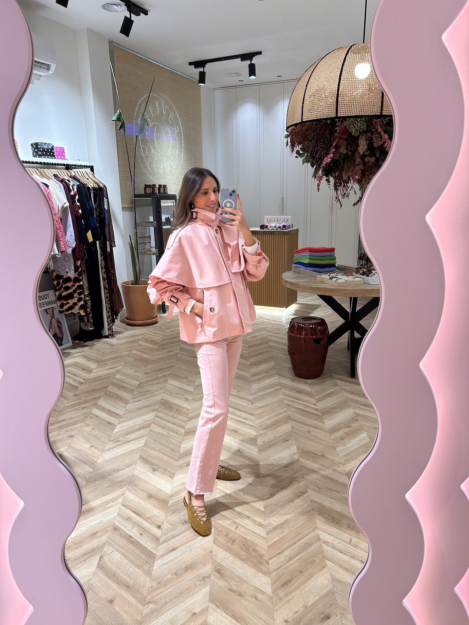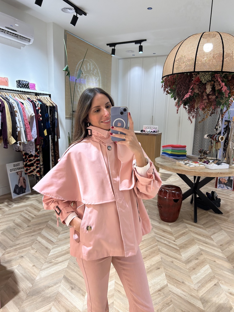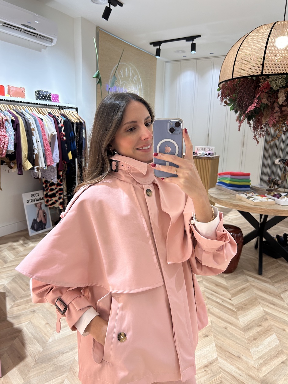 Gabardina corta con cuello sopala y trabillas en hombros, manga larga con detalle de trabillas en los puños. Cierre en delantero con botones ocultos en tapete. Bolsillos de solapa en laterales con cierre de botón. Lleva forro.