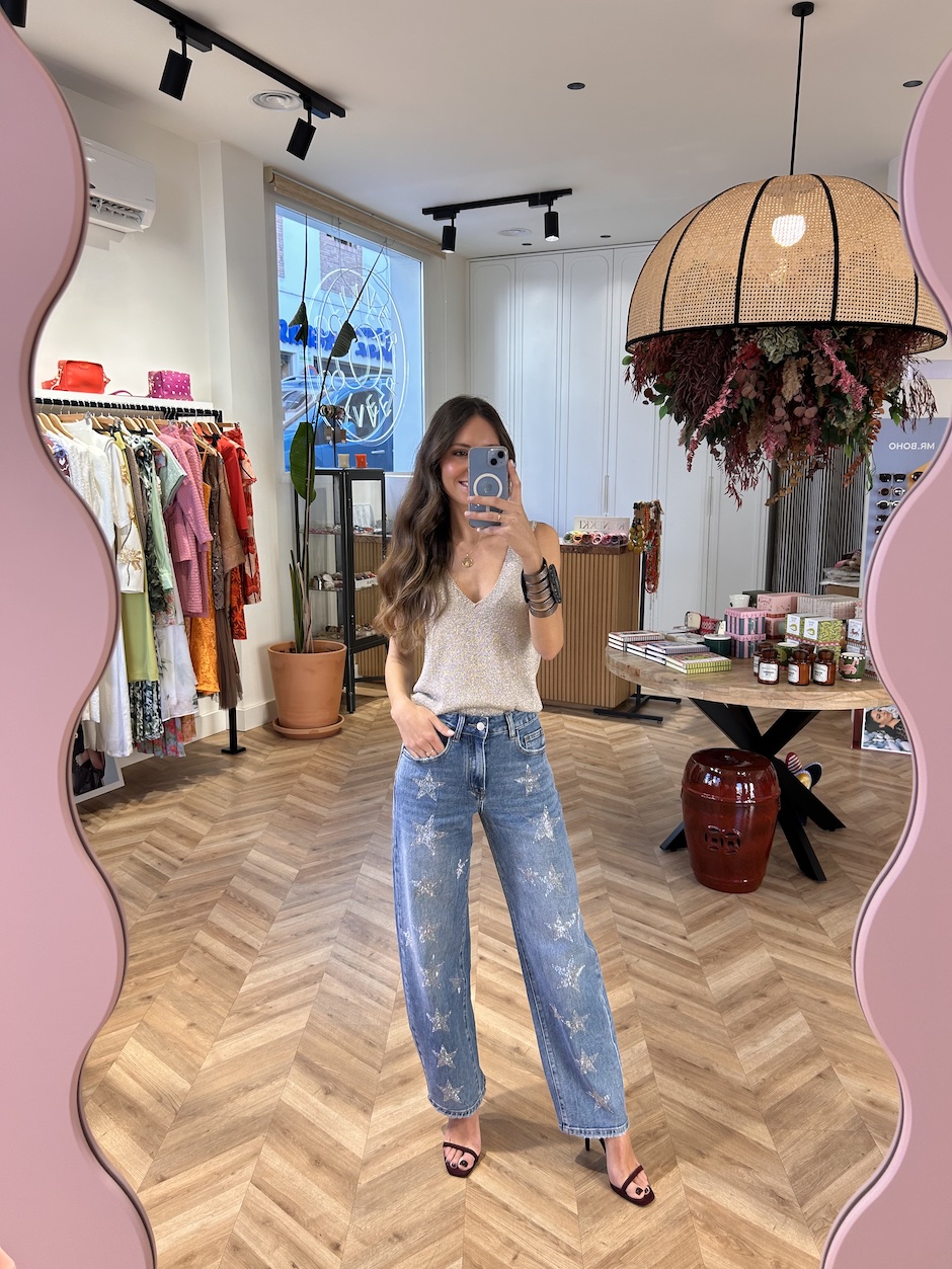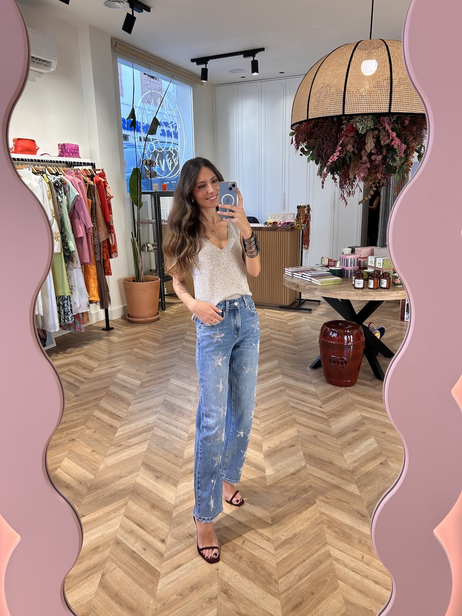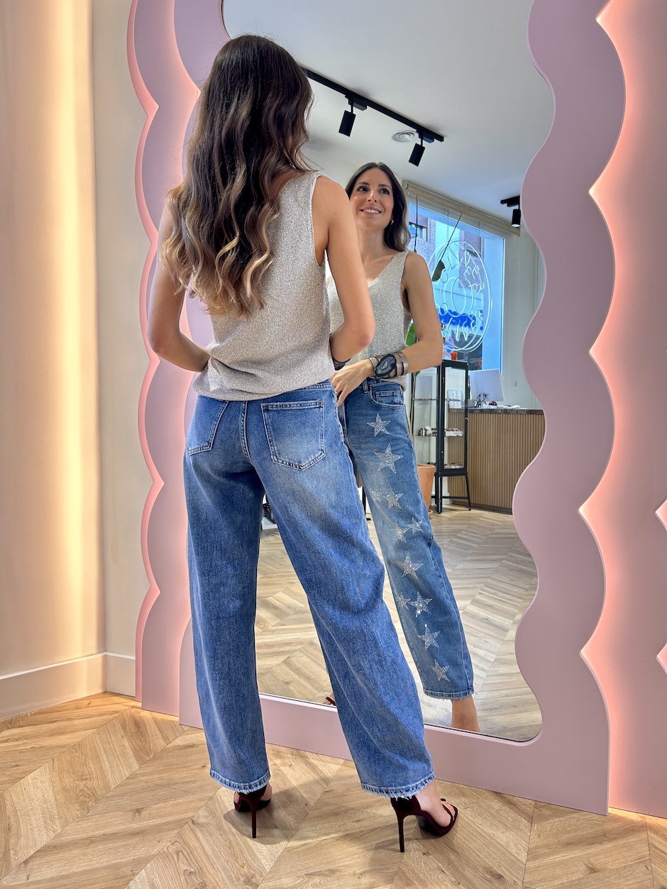 Jeans boyfriend con cinco bolsillos. Tiro medio, con trabillas en cintura. Cierre en delantero con cremallera y botón. Detalle de estrellas con aplicaciones joya en delantero.