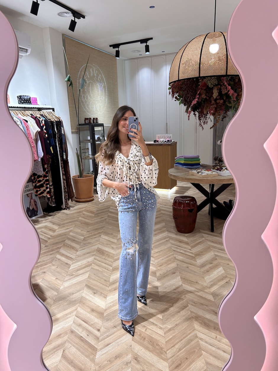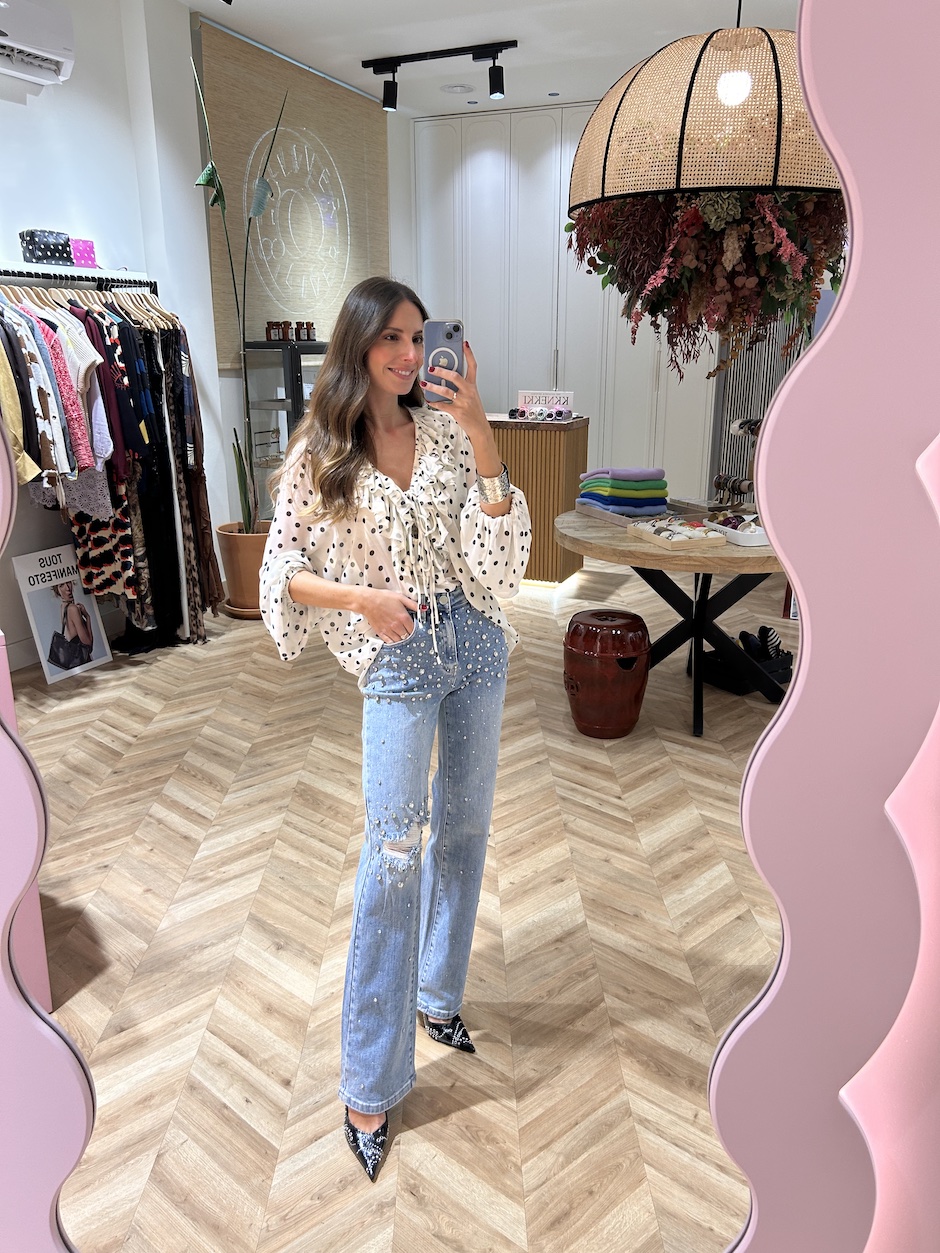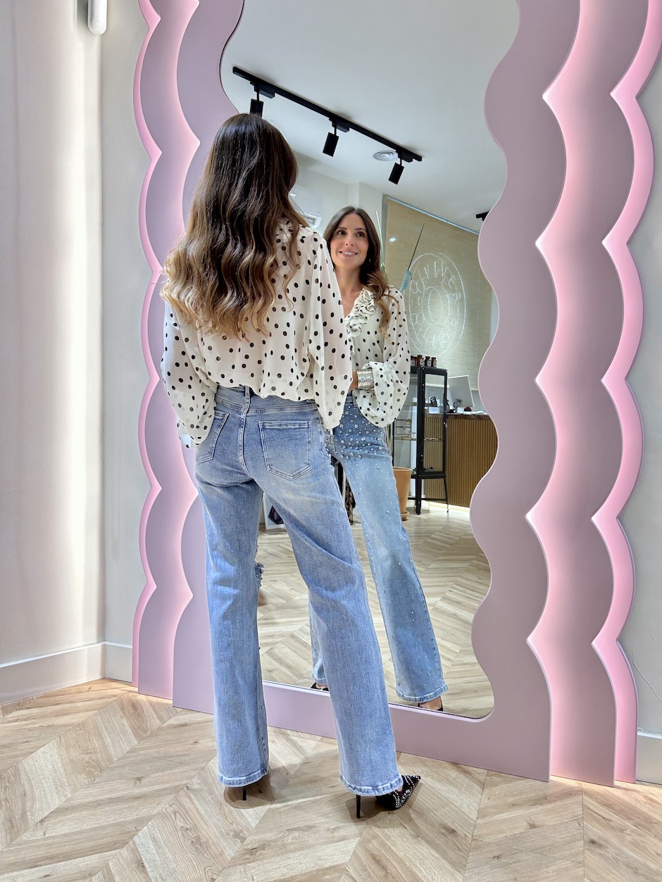 Jeans con cinco bolsillos de tiro alto con trabillas en cintura. Cierre en delantero con cremallera y botón. Detalle de aplicaciones joya en delantero, con rotos en rodilla.