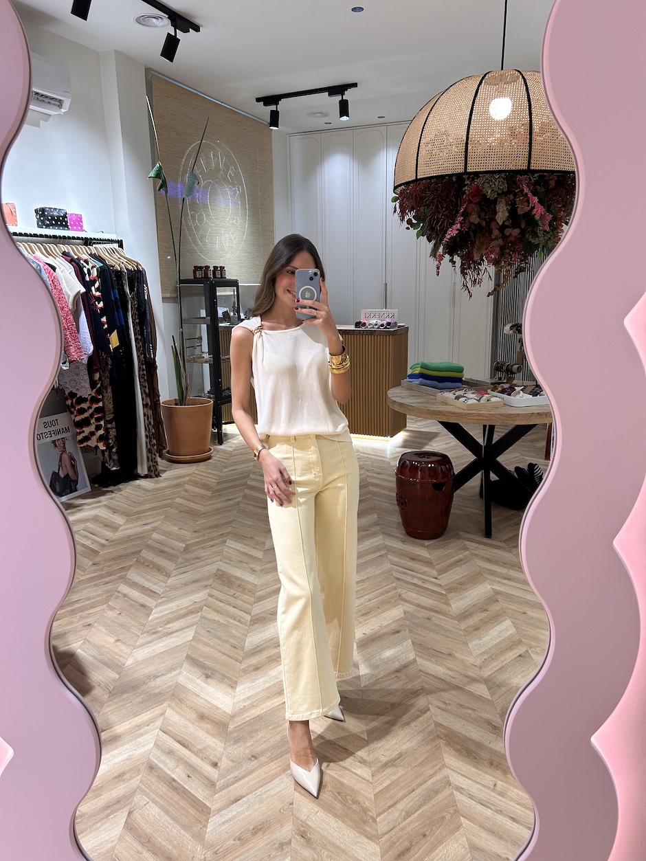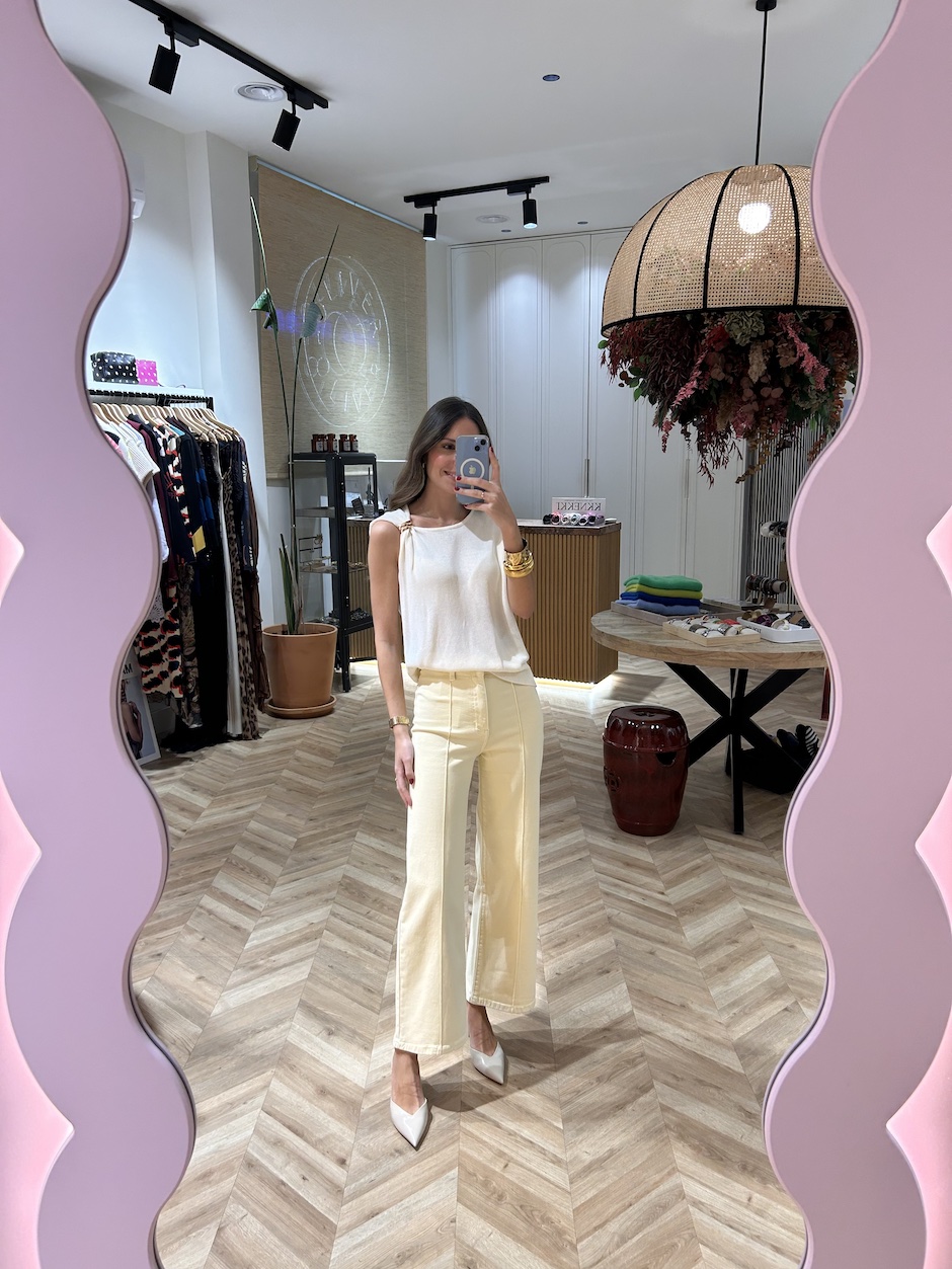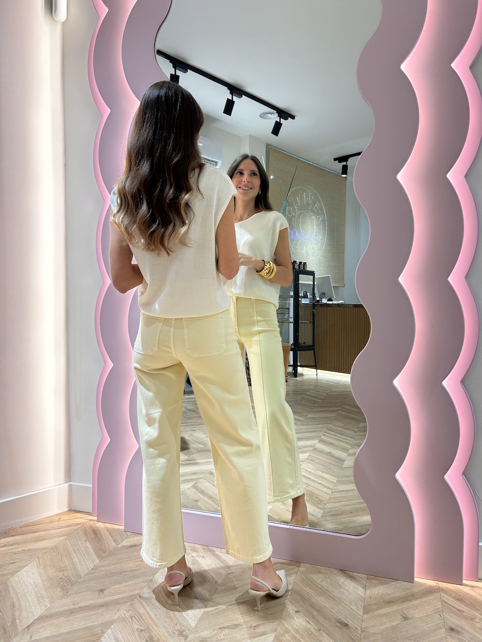 Jeans wide leg de tiro alto con trabilla en cintura. Cierre en delantero con cremallera y botón. Detalle de nervio en pernera. Bolsillos de parche en espalda.