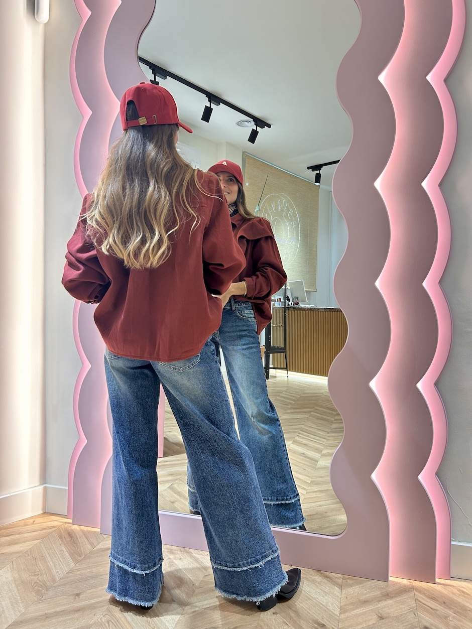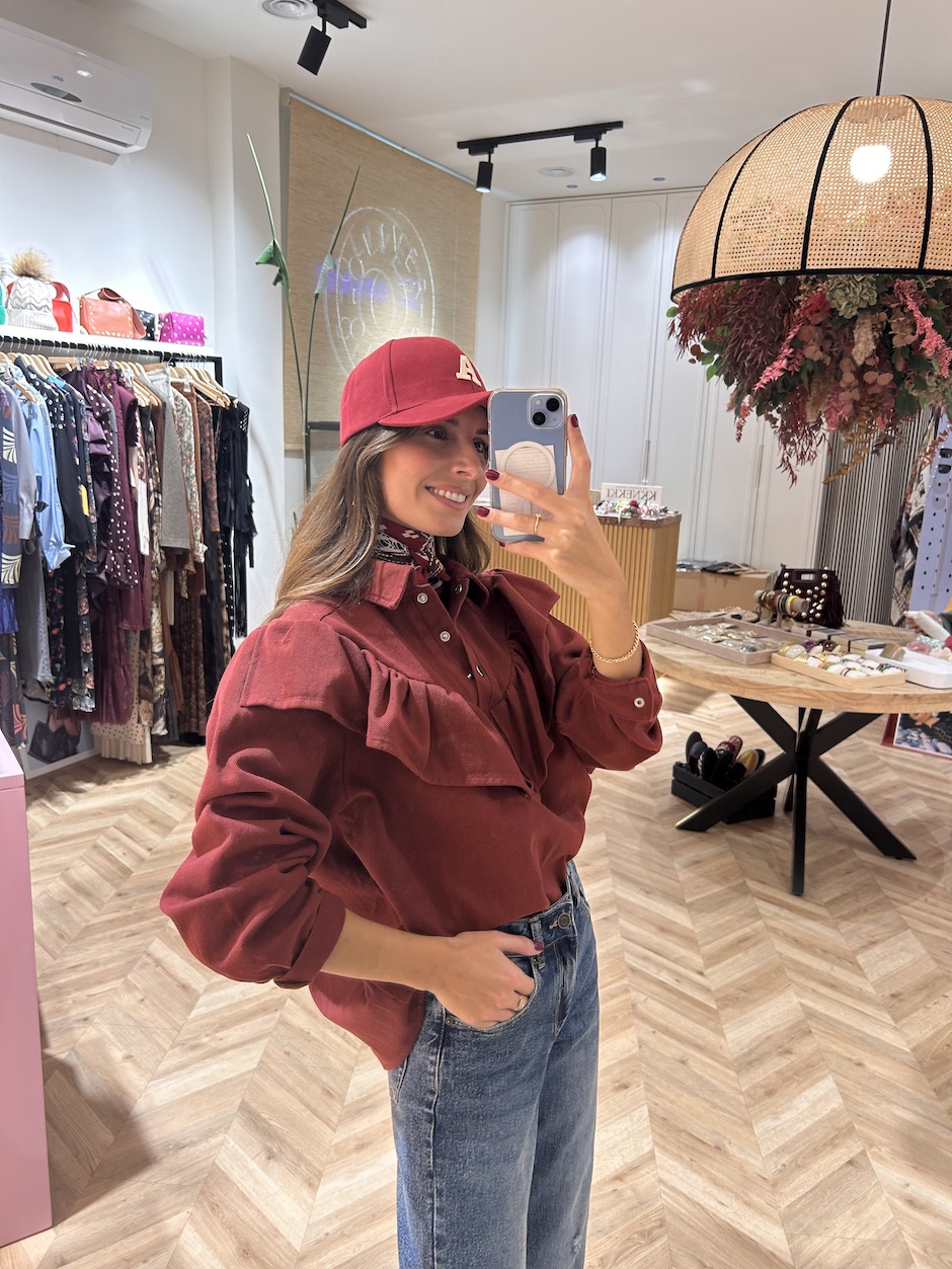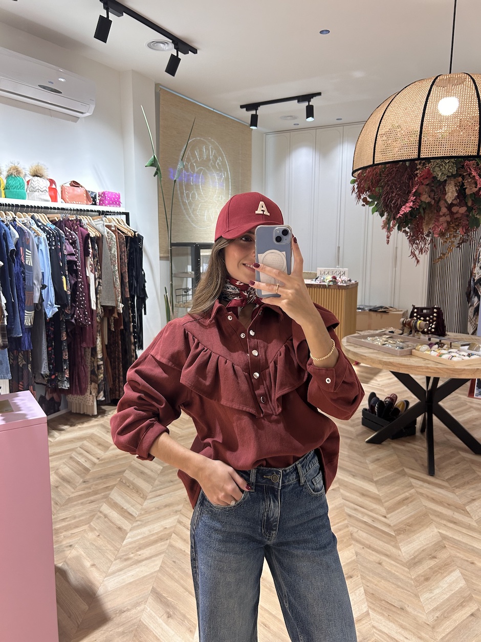 Sobrecamisa vaquera con cuello solapa y manga larga acabada en puño con cierre de clip. Cierre en el pecho con botones de clip. Detalle de volante en delantero.