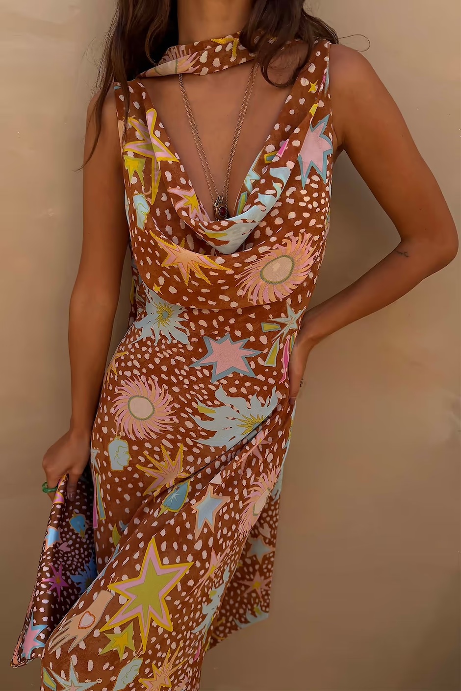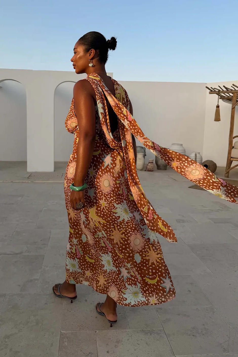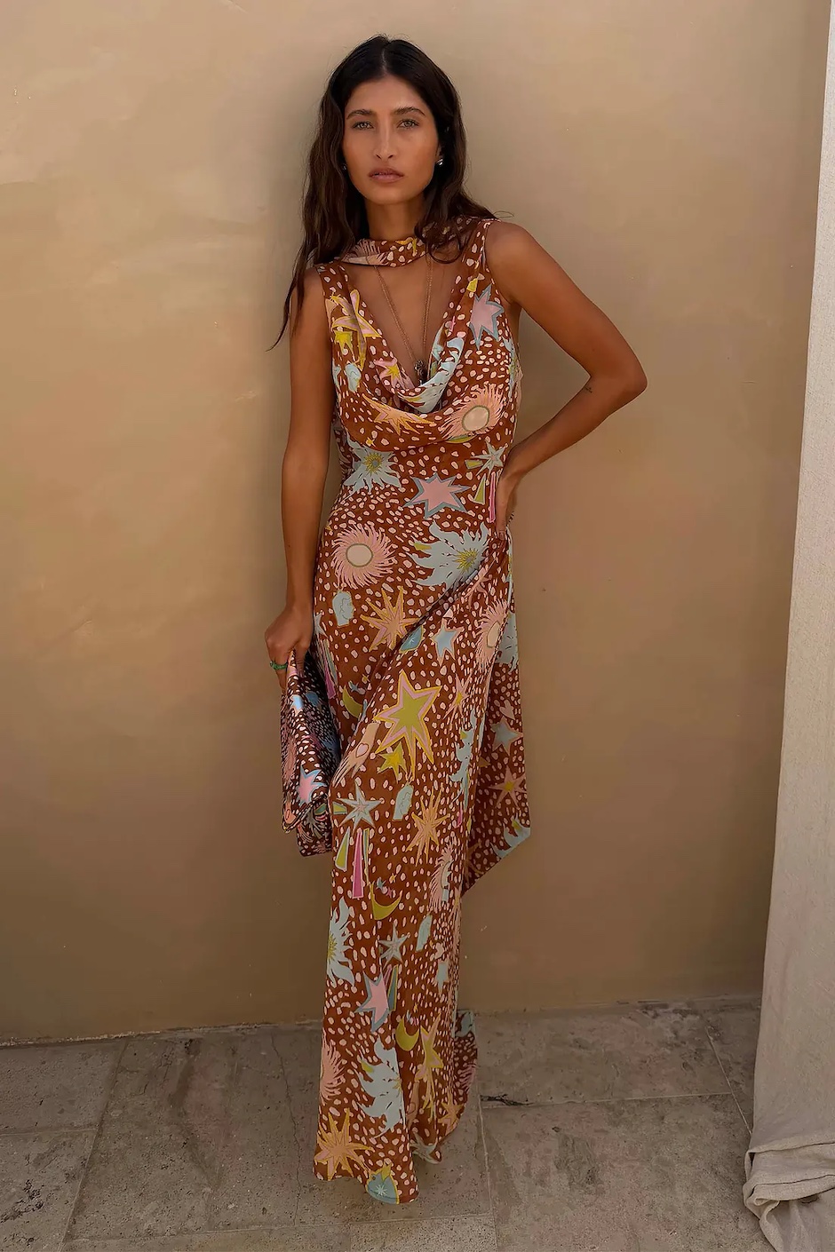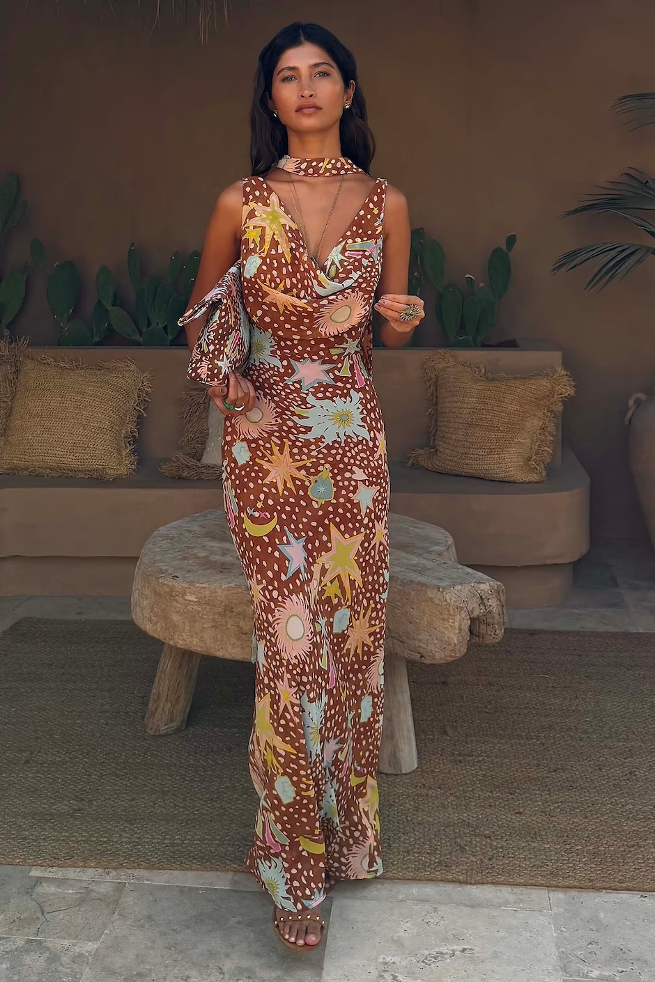Nuestro icónico vestido de Sophie está de vuelta, con un nuevo estampado elegante! Sobre una sutil base marrón, hemos combinado nuestro estampado de leona con una gama de motivos de nuestras nuevas colecciones de 2026, como nuestros diseños de sol, estrella y palma. Con una suave cortina en la parte delantera, una llamativa espalda y detalle de bufanda que hace un guiño a los textiles tradicionales. Inspirada en el arte del sur de Asia, la bufanda se puede usar alrededor del cuello o atada alrededor de la cintura para un look de vacaciones con múltiples ropa o una declaración de invitado de boda.
