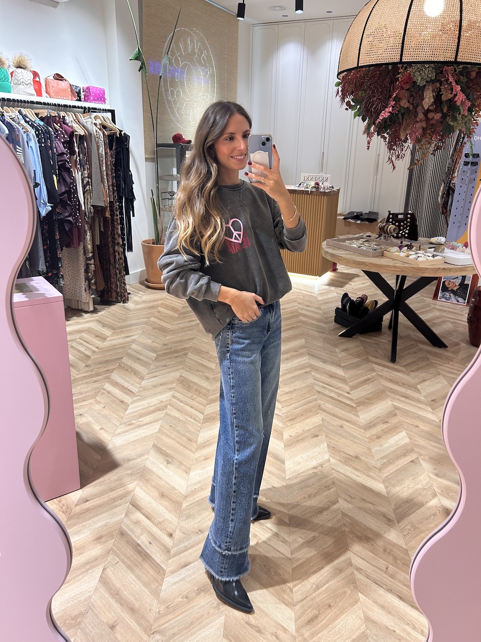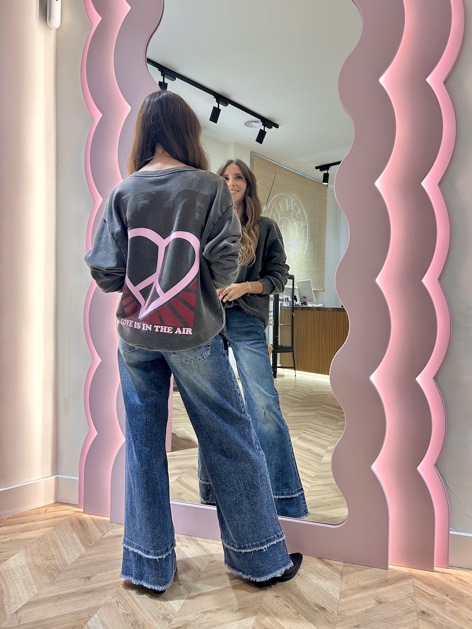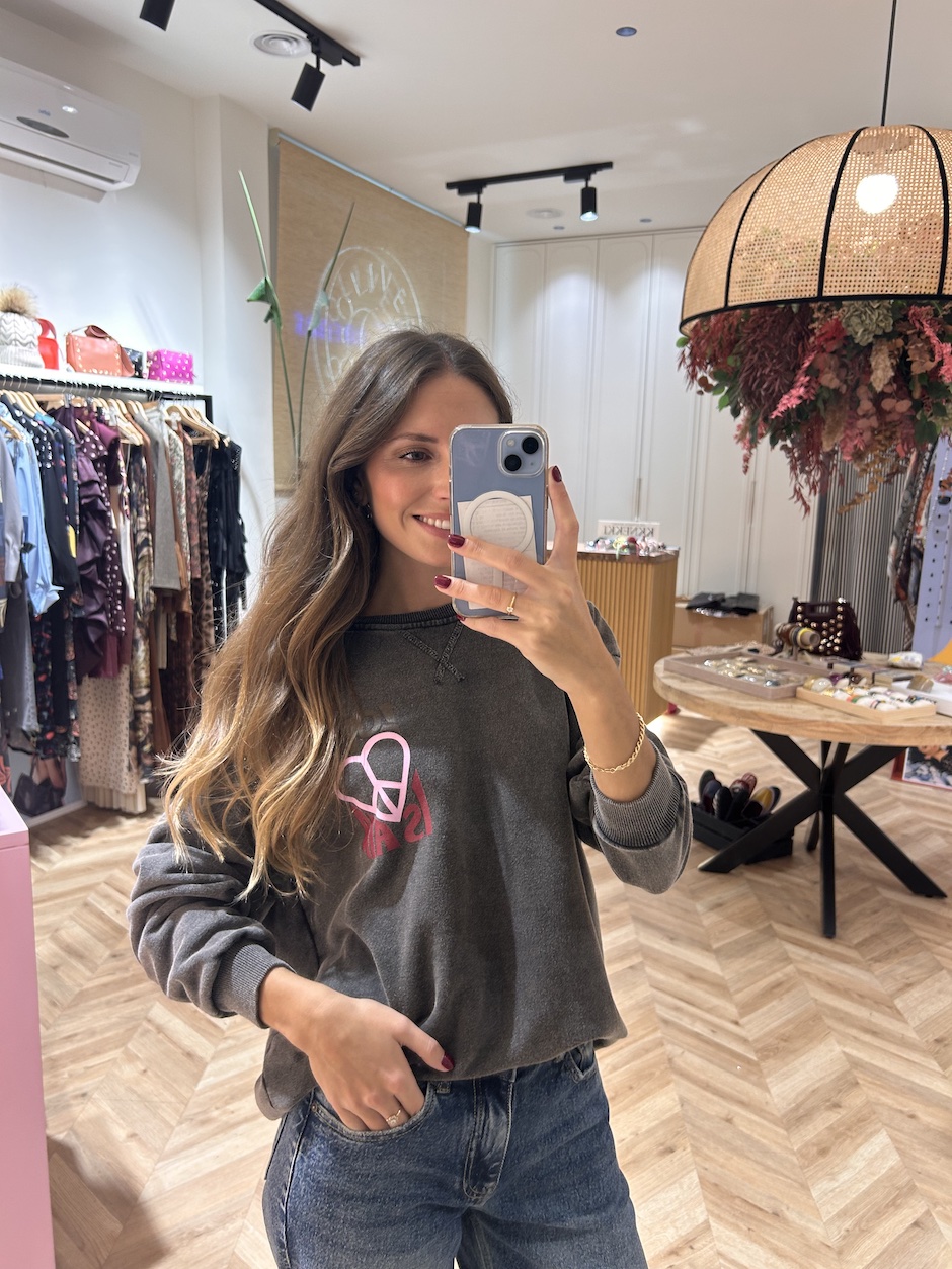 Sudadera con efecto lavado. Cuello redondo rib y manga larga acabada en puño rib. Detalle de serigrafía en el pecho y espalda. Bajo acabado en rib.