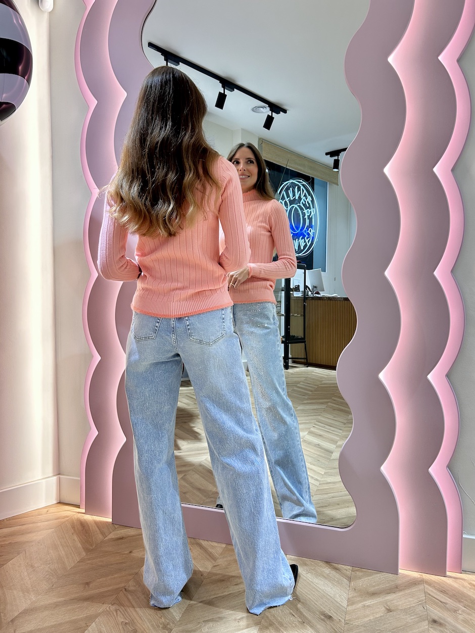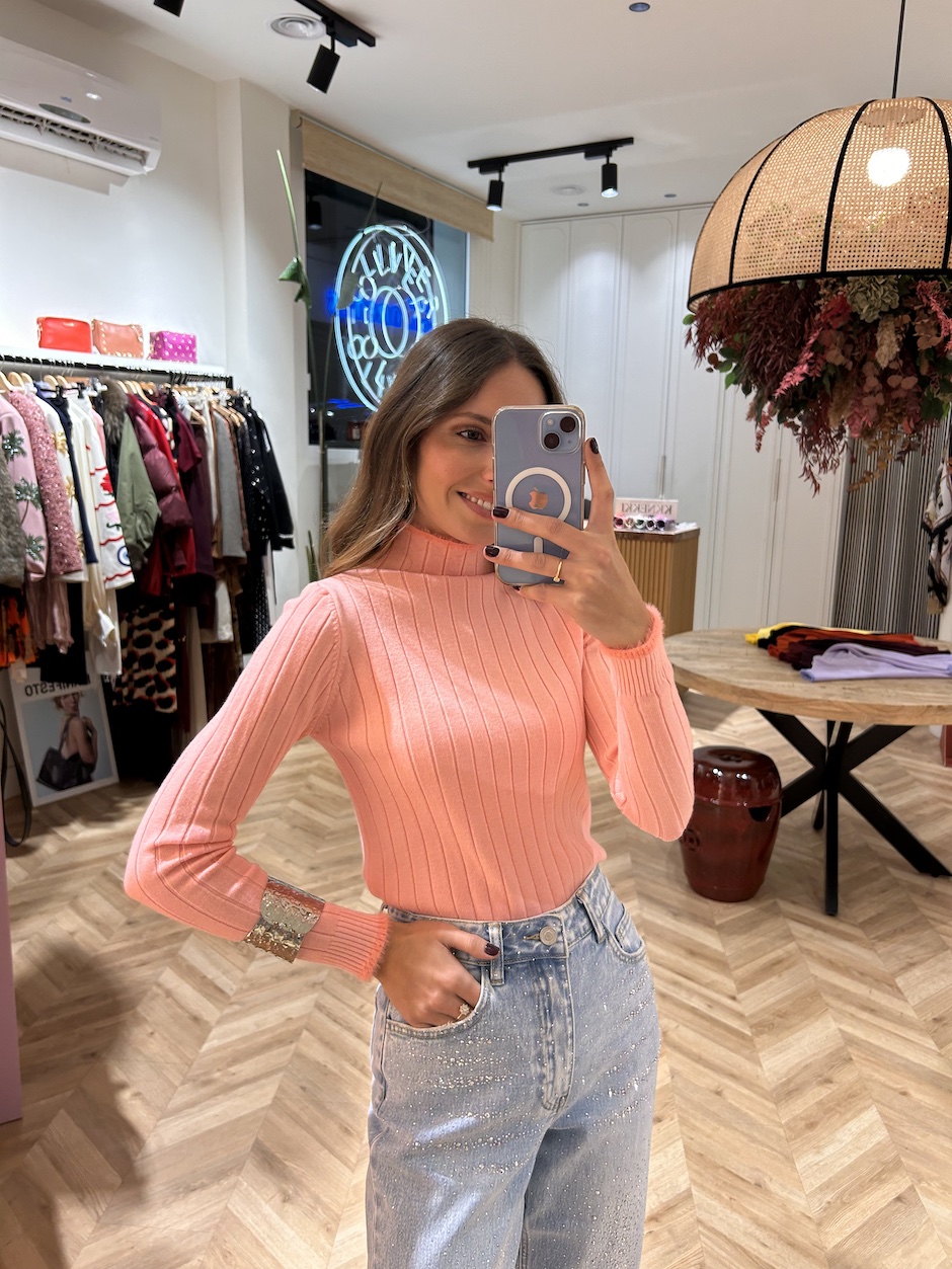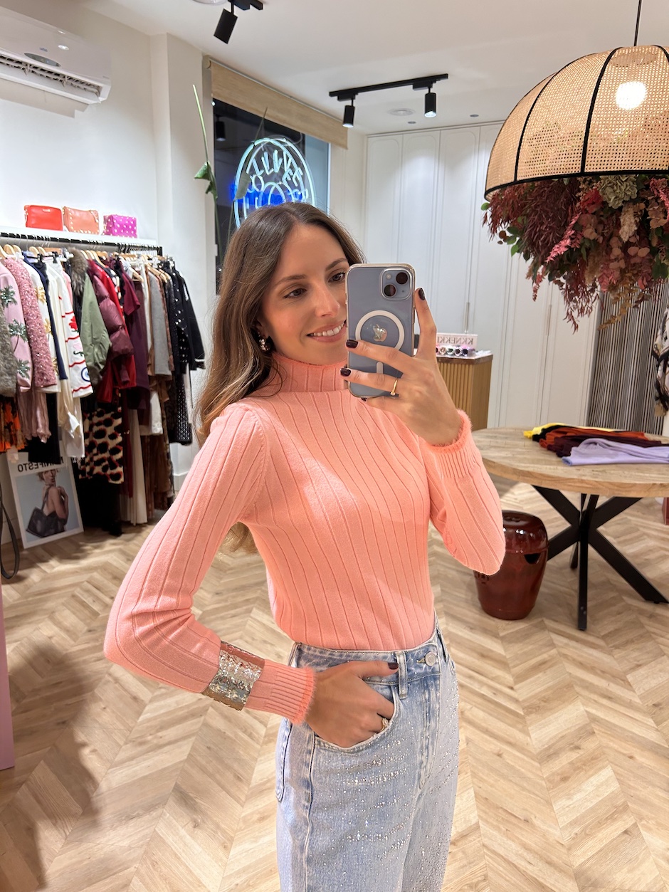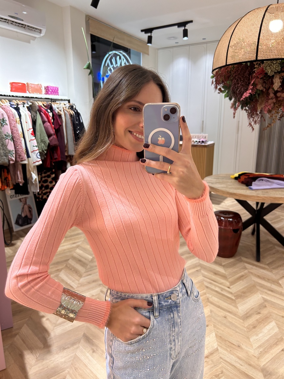 Suéter de canalé con cuello perkins y manga larga. Detalle de ribete de pelo.