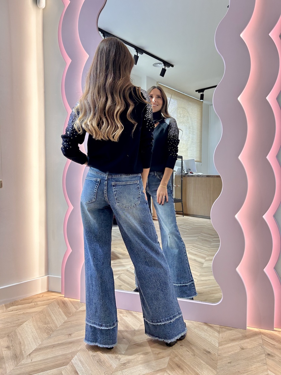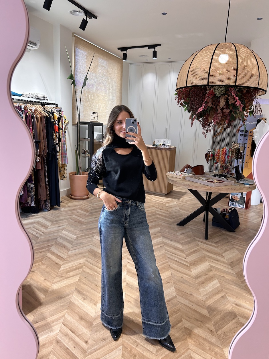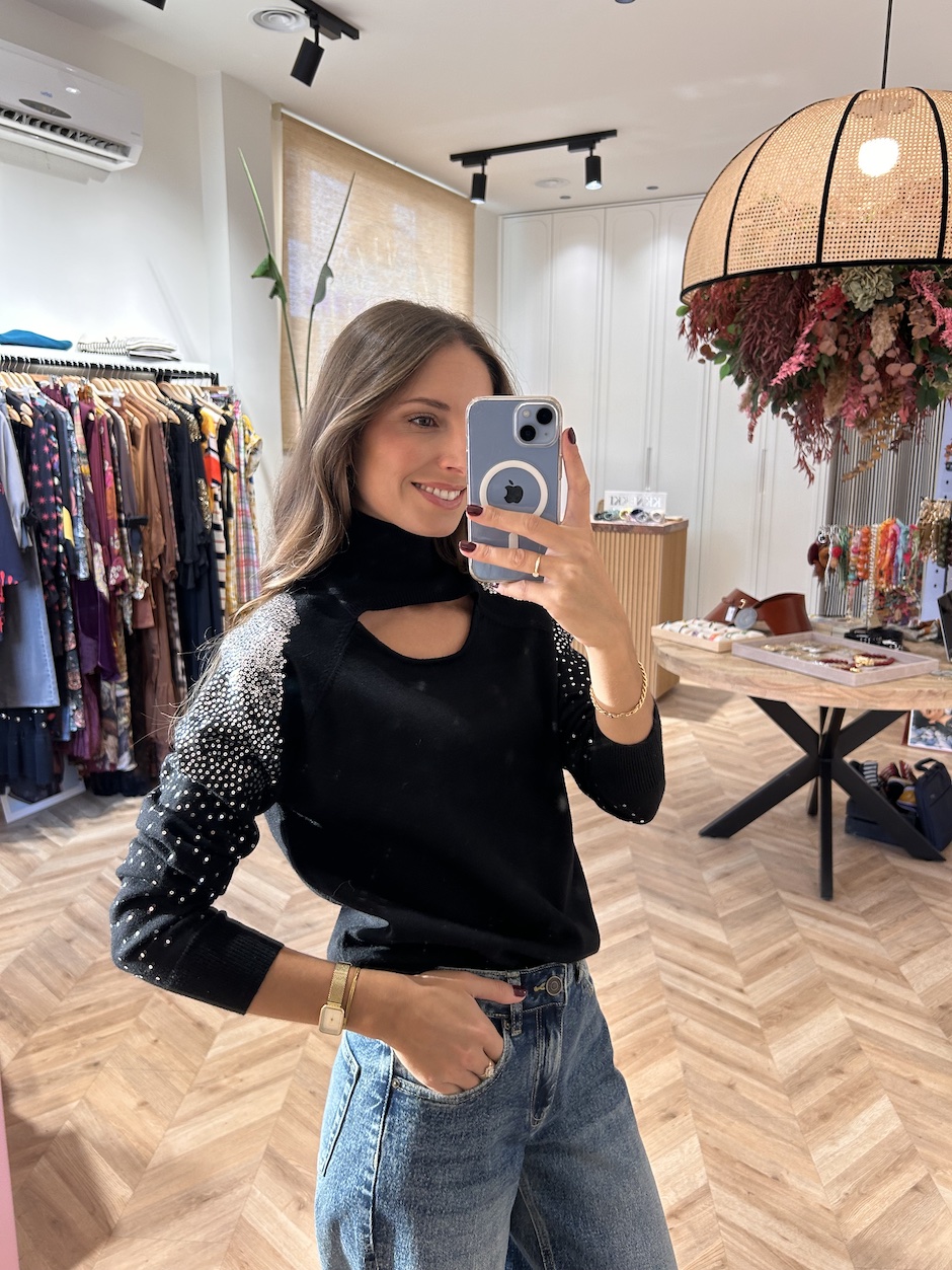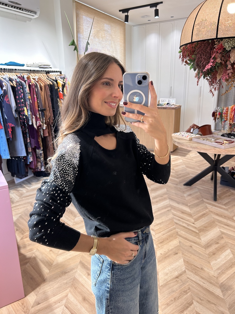 Suéter cut out con cuello vuelto y manga larga acabada en puño rib. Detalle de lentejuelas degradadas color plata en las mangas. Bajo acabado en rib.