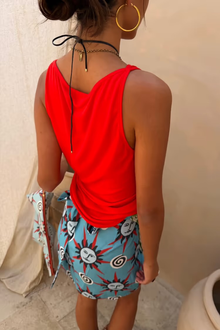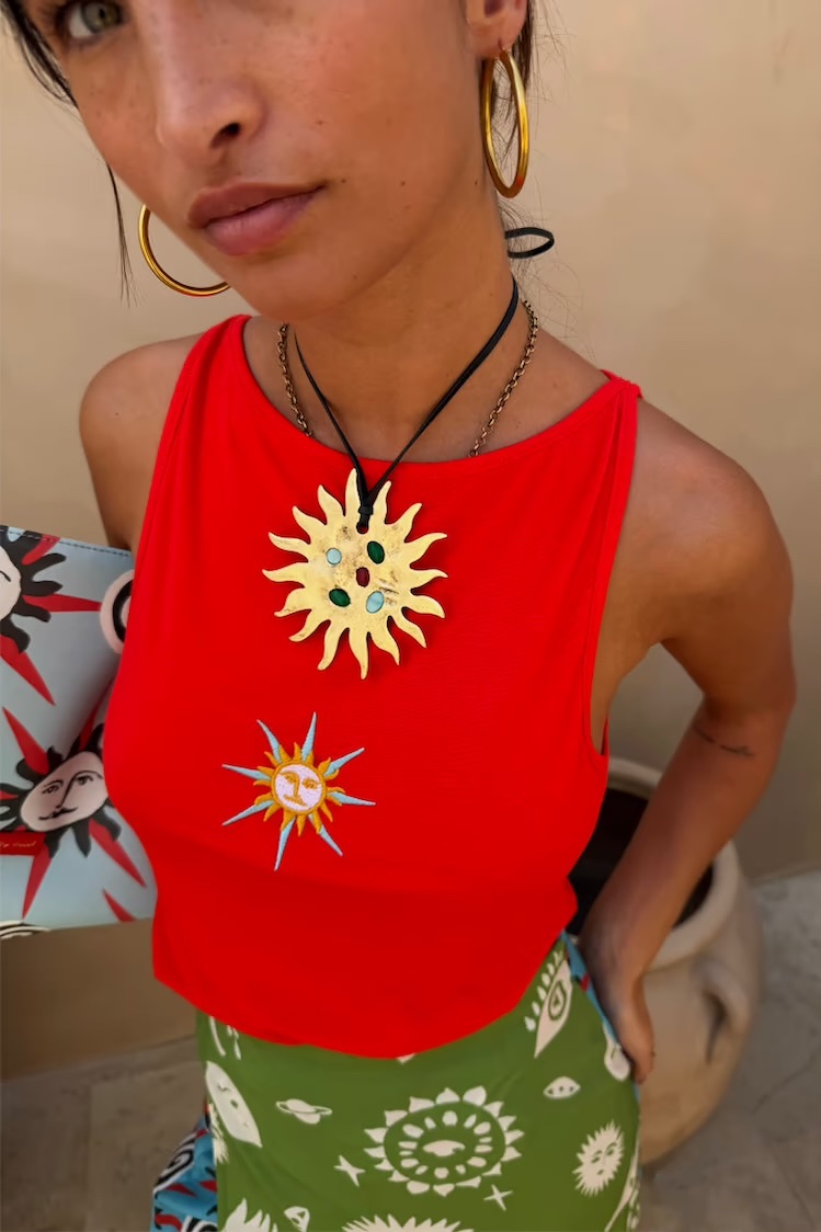 Camiseta con cuello redondo y tirantes. Detalle de sol bordado en el pecho. Color naranja vibrante.