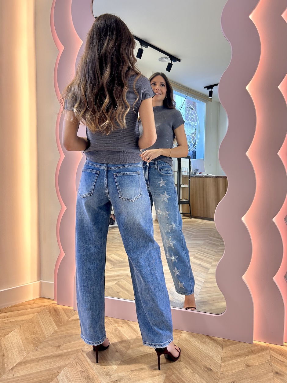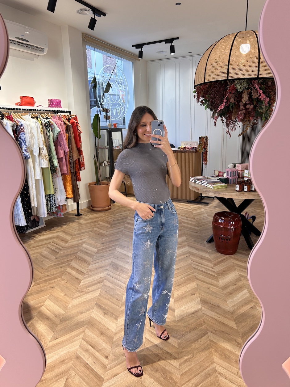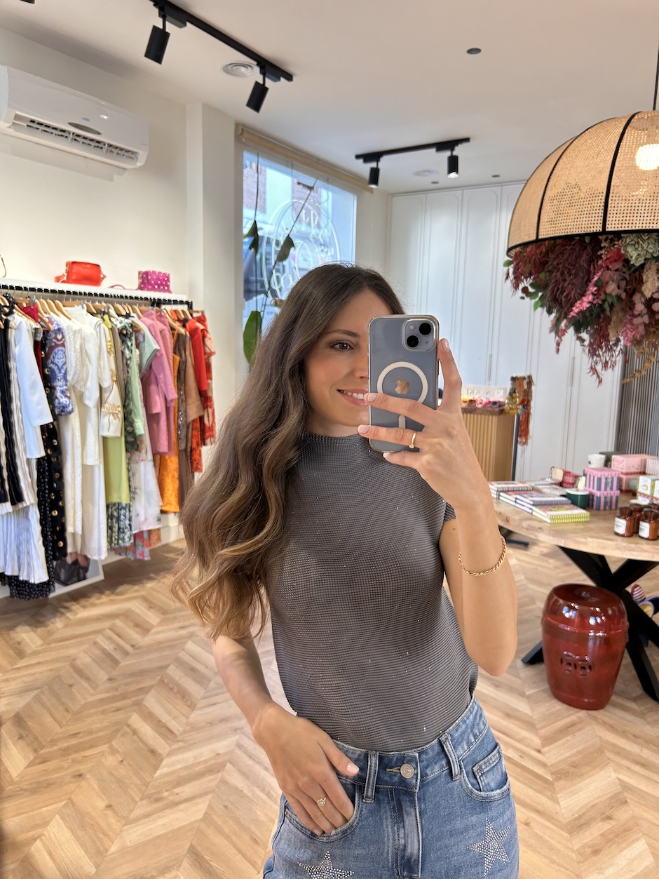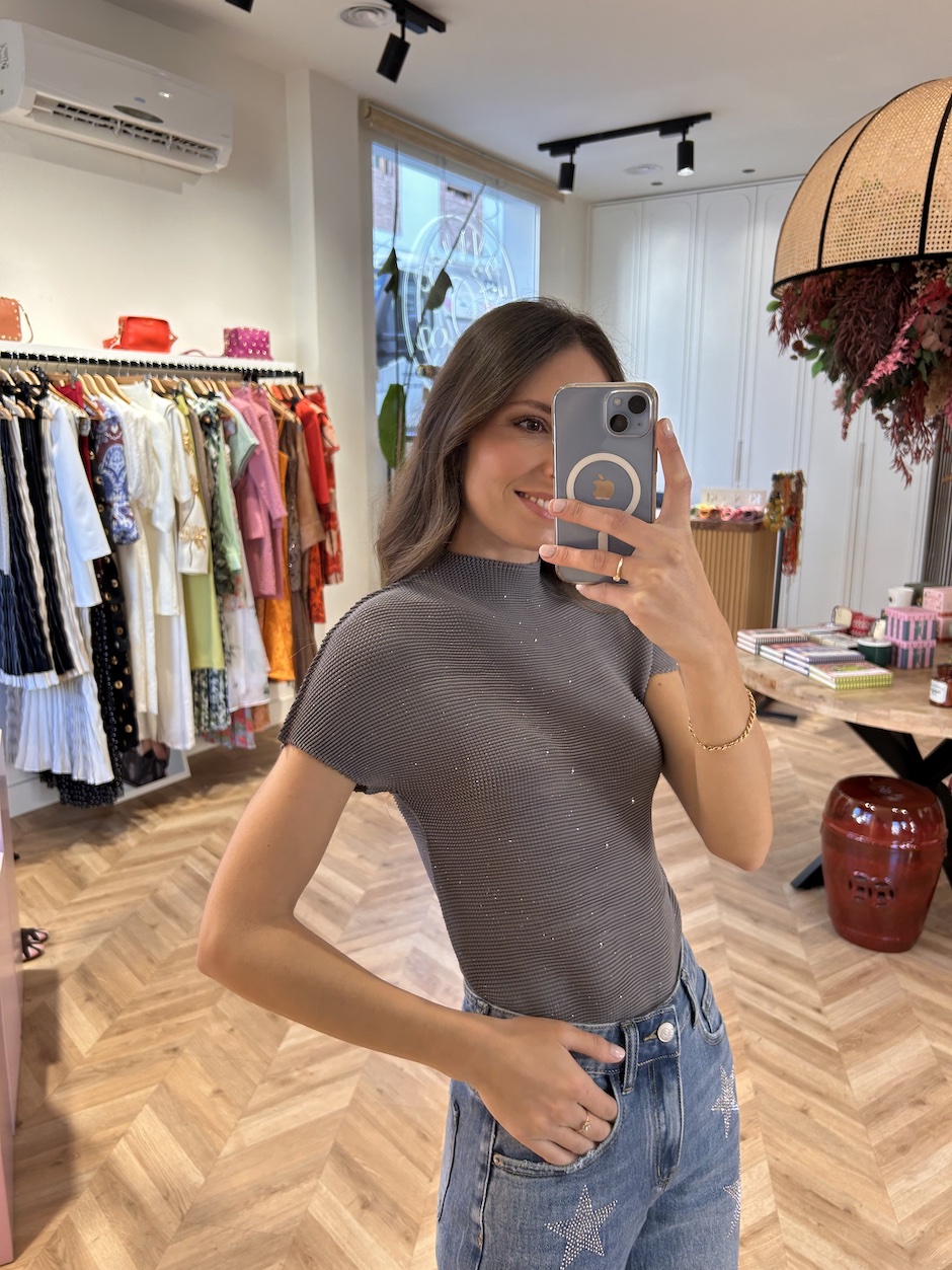 Top plisado con detalles glitter. Cuello perkins y manga corta. Color gris