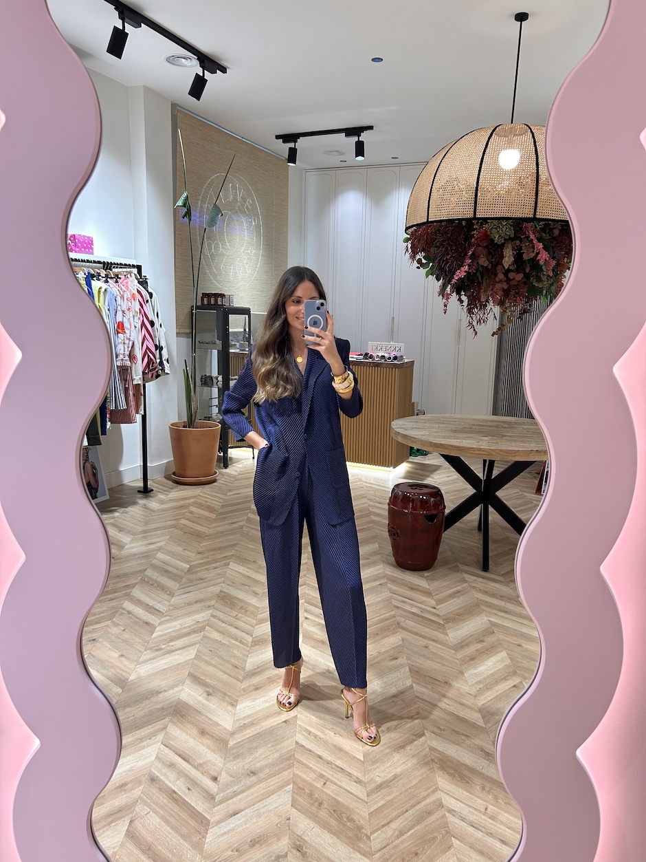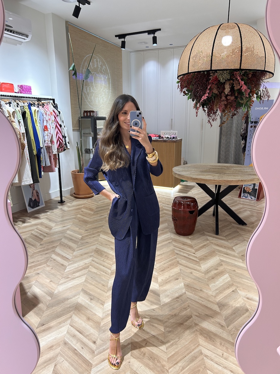 Traje plisado, blazer con cuello solapa y manga larga. Cierre en frontal con botones. Bolsillos de plastrón en delantero. Detalle de aberturas en laterales. Pantalón barrel con cintura elástica. Bolsillos en laterales.