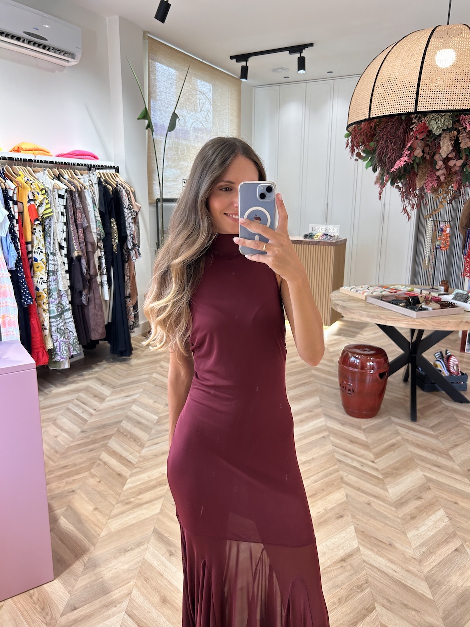 Vestido largo de tul con cuello halter y manga sisa. Detalle de fruncido en laterales. Falda semitransparente con godets.