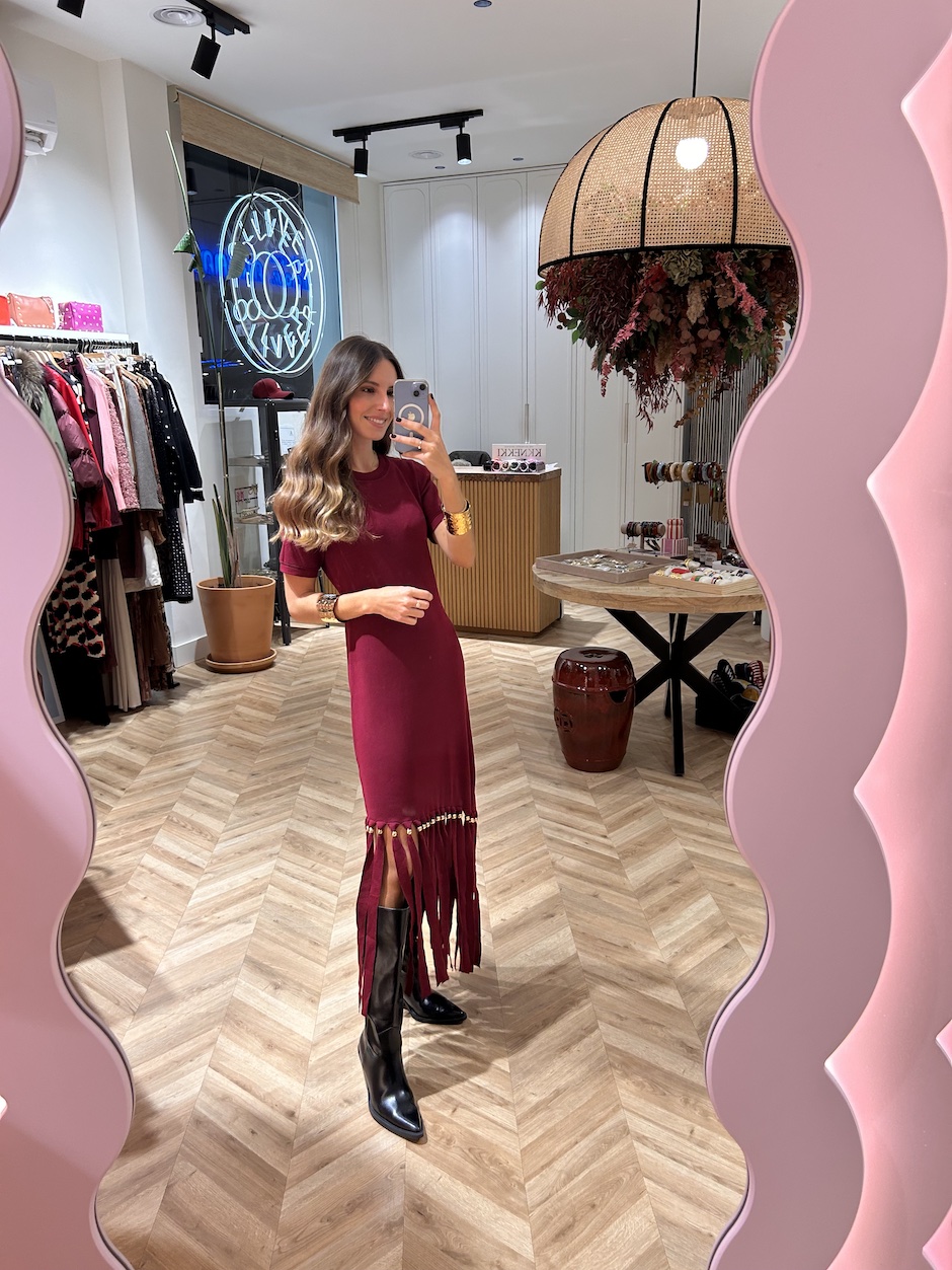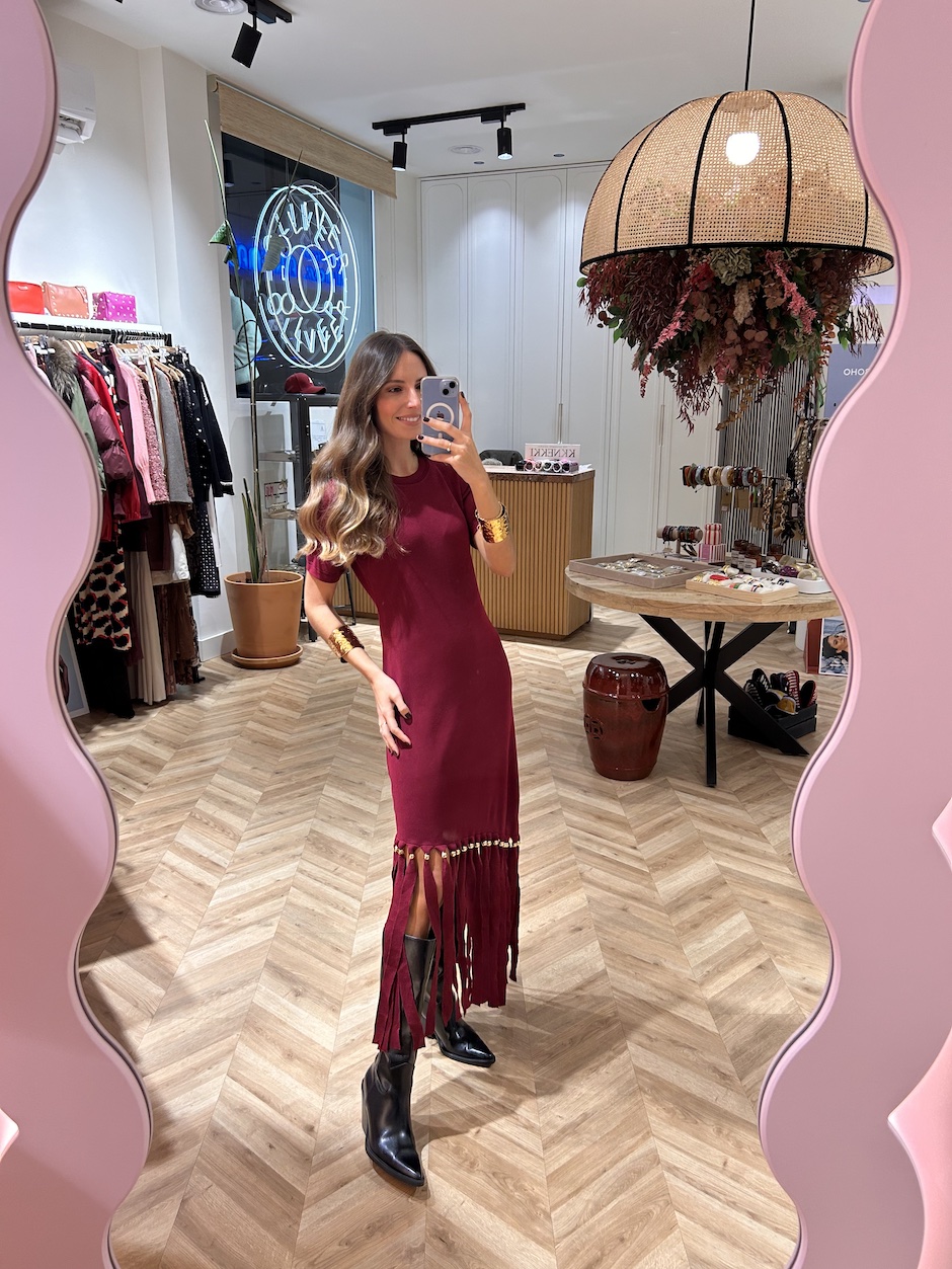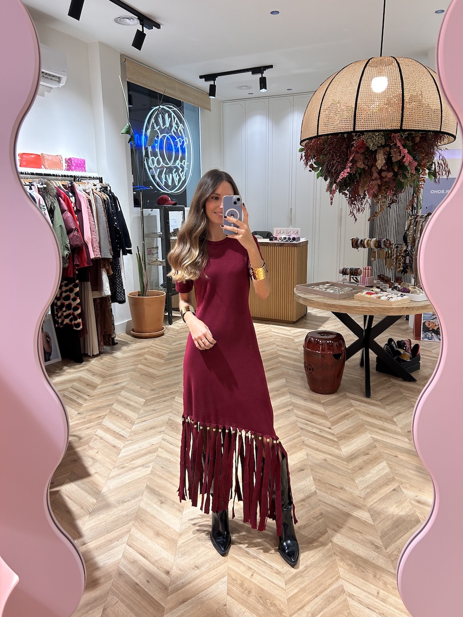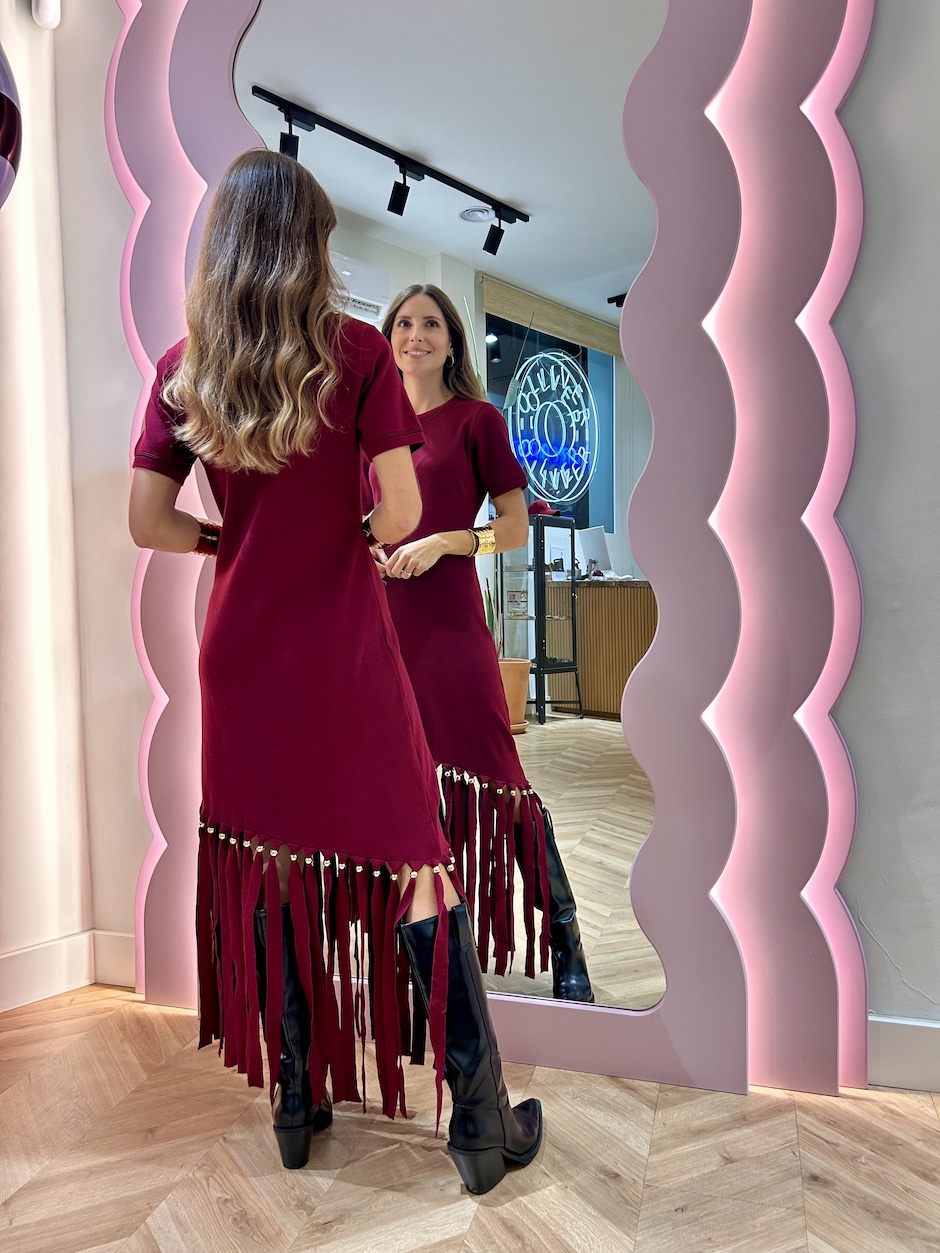 Vestido de punto con flecos, con cuello redondo y manga corta. Detalle de aplicaciones doradas en flecos.