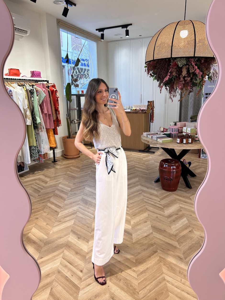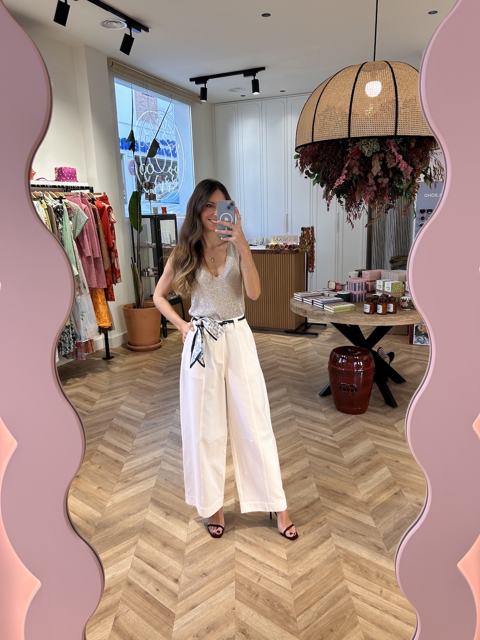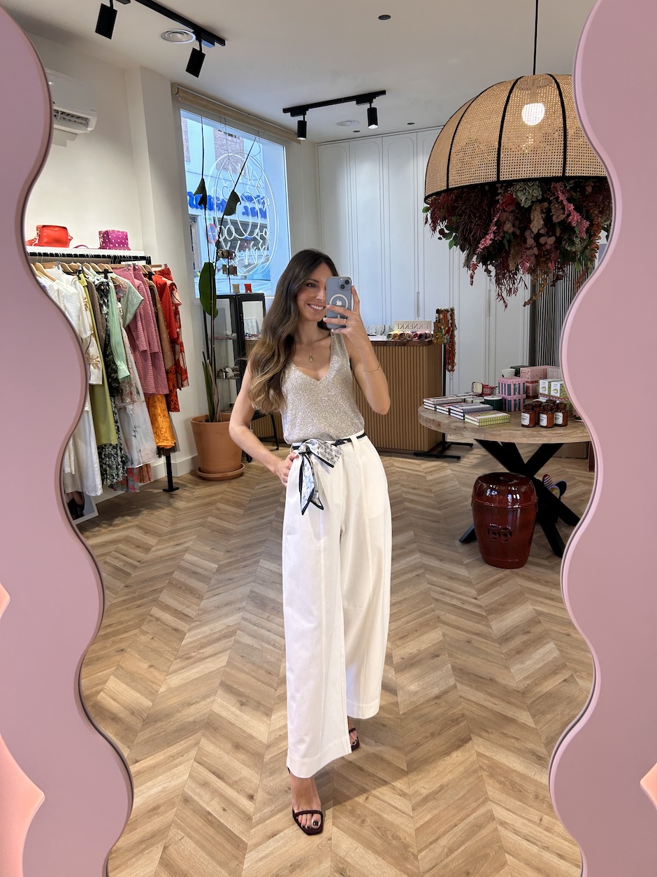 Pantalón Balloon con detalle de nervio. Tiro medio con trabillas anchas. Cierre en delantero con botón y cremallera. Cinturón trenzado efecto piel, con pañuelo incluido. Bolsillos en laterales y bolsillos de solapa en la espalda.